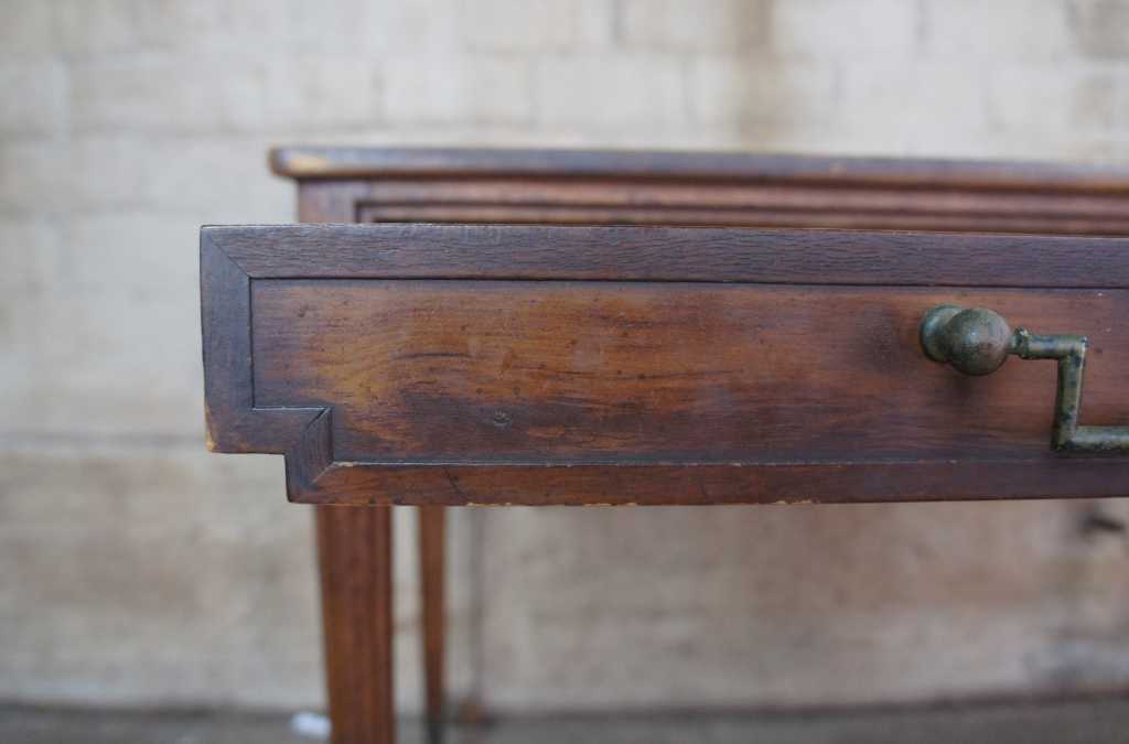 Vintage Desk; features a petit leather top mahogany writing desk. Two drawers, long thin tapered and fluted legs, castors. Original leather top has been painted and distressed.