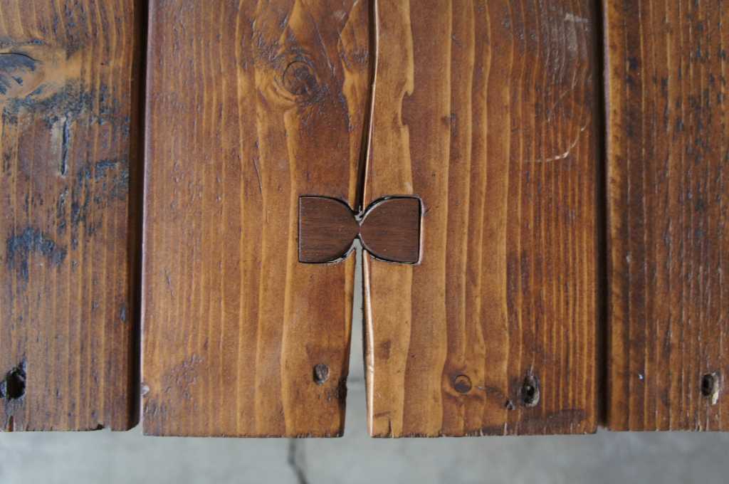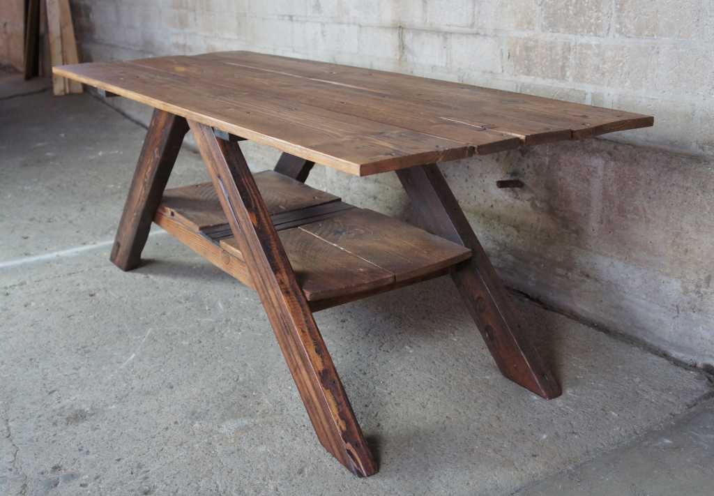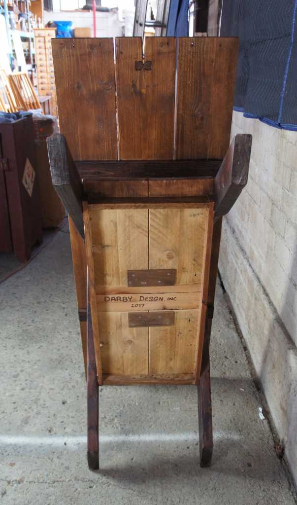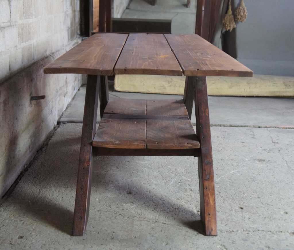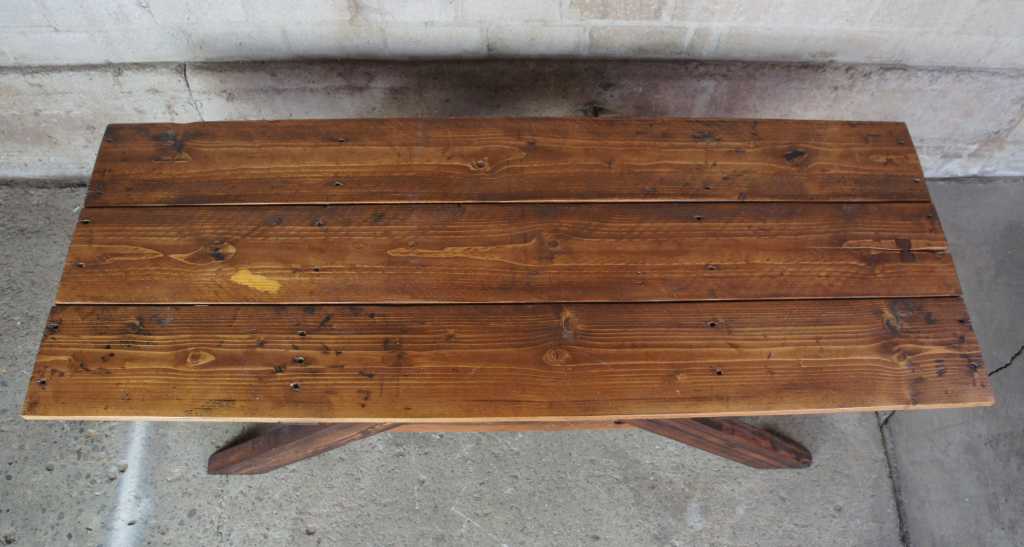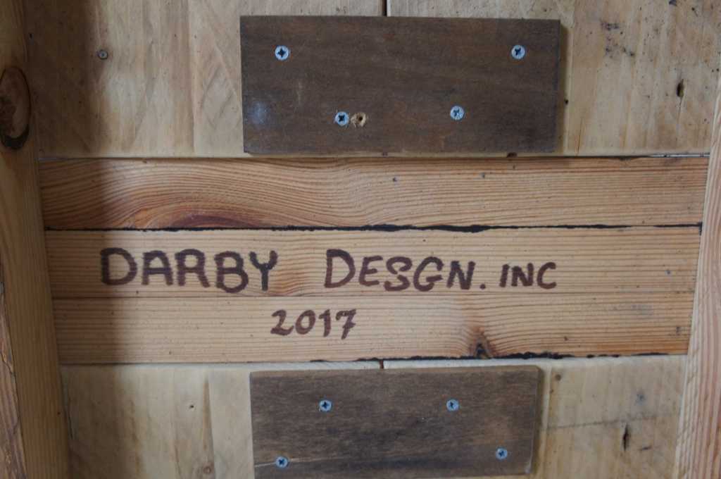 Darby Designs Coffee Table, made in 2017. Features rustic pine, plank top. Signed on underside. Great for use as coffee table, TV display, end of bed, hall, side, end accent area.