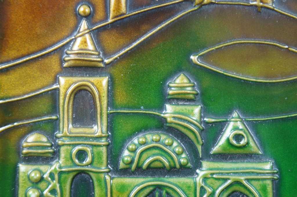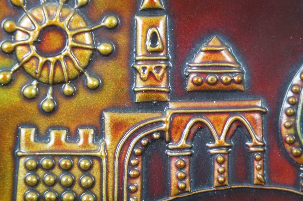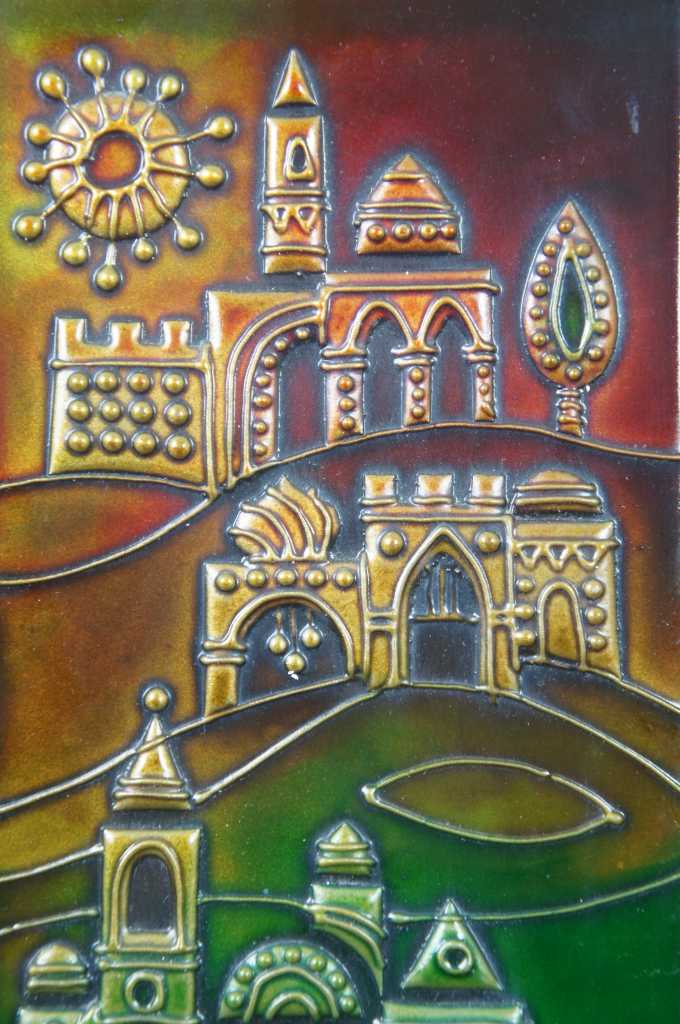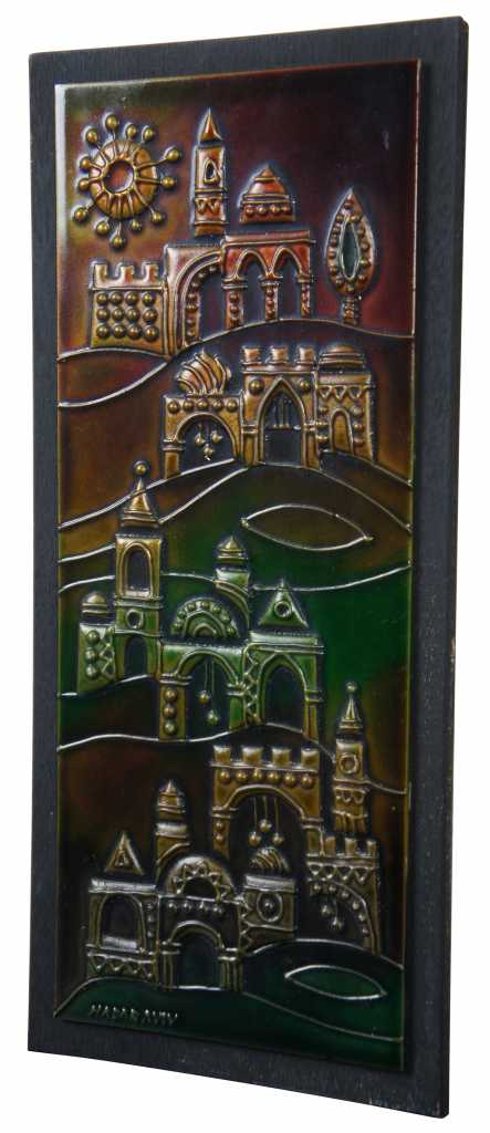 Jerusalem Plaque, features the holy city on enameled copper over wood.