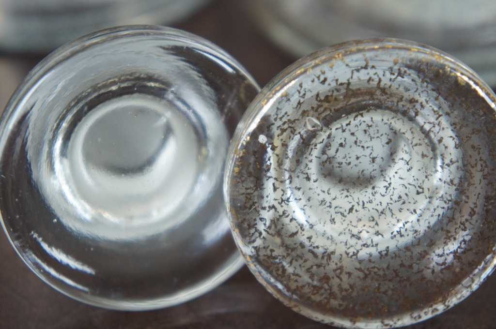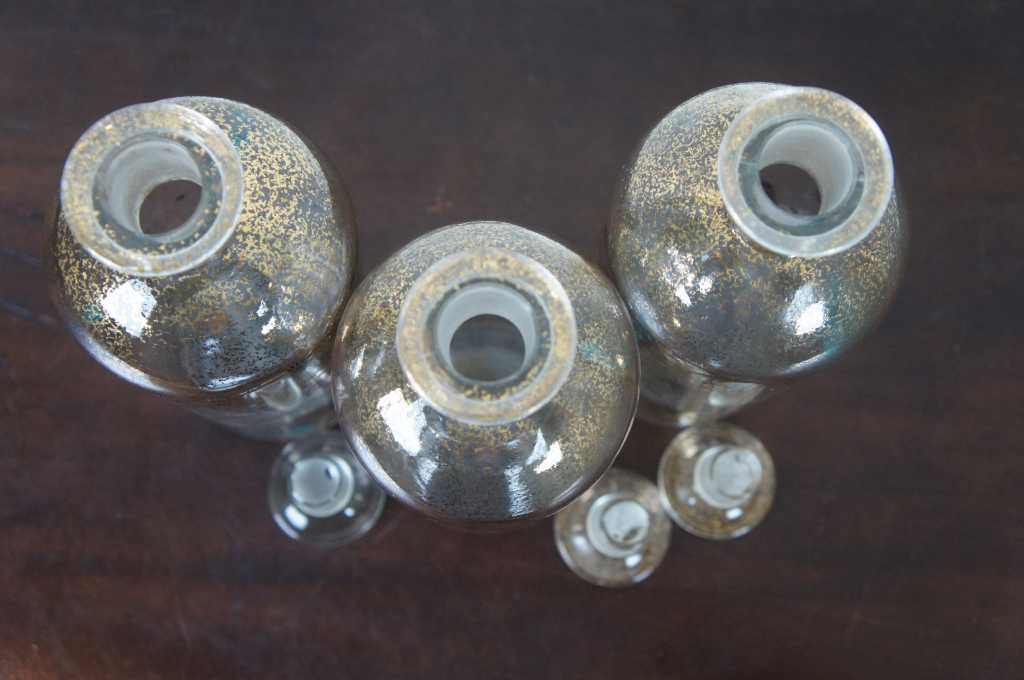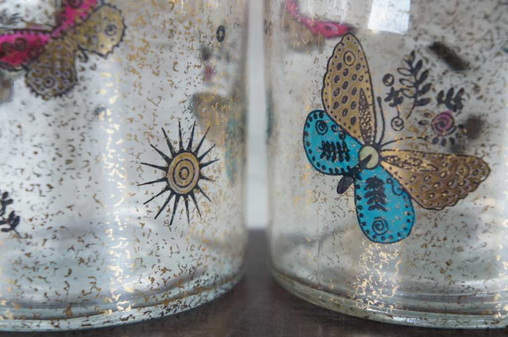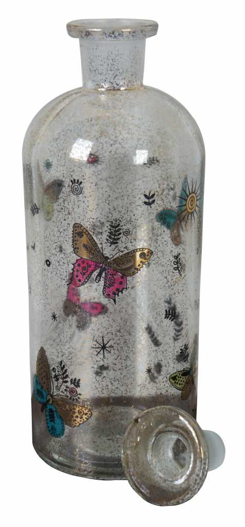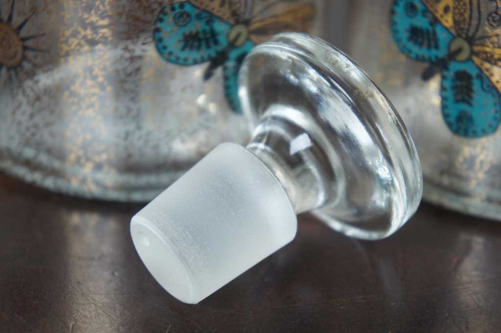Butterfly Bottle Trio by Georges Briard, features hand painted details on TCW Co glass decanters, glass on glass stoppers.