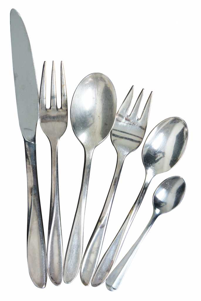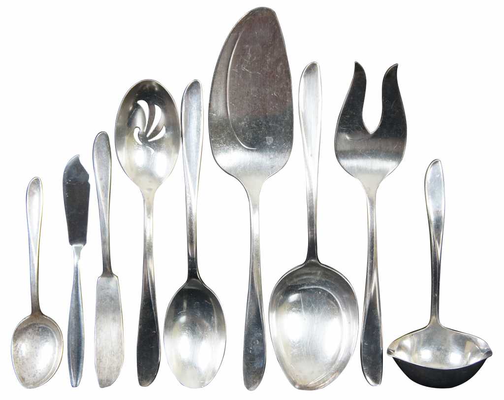 Rubbermaid Tray - 13.75” x 11.75” x 1.75” / Cake Server - 10.5” x 2.25” / Large Serving Spoon - 9” x 2.5” / Serving Fork - 9” x 2” / Serving & Slotted Serving Spoon - 8.5” x 1.75” / Ladle - 6.25” x 2.75” / Butter Knife 1 - 6.5” x 0.75” / Butter Knife 2 - 7.125” x 0.75” / Sugar Spoon - 6” x 1.5” / 8 Table Knives - 9” x 0.75” / 8 Table Spoons - 6.75” x 1.5” / 18 Teaspoons - 6” x 1.25” / 8 Salad Forks - 6.5” x 1.125” / 8 Dinner Forks - 7.125” x 1” / 7 Coffee Spoons - 4.25” x 1”