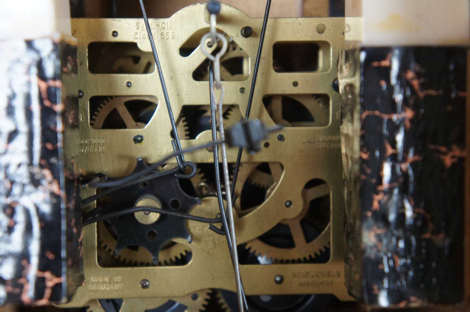 Vintage carved Black Forest cuckoo clock made in West Germany, featuring hunting bags with a rabbit and a pheasant, topped with crossed rifles and mounted stag, with a leaf shaped pendulum and pine cone weights.
