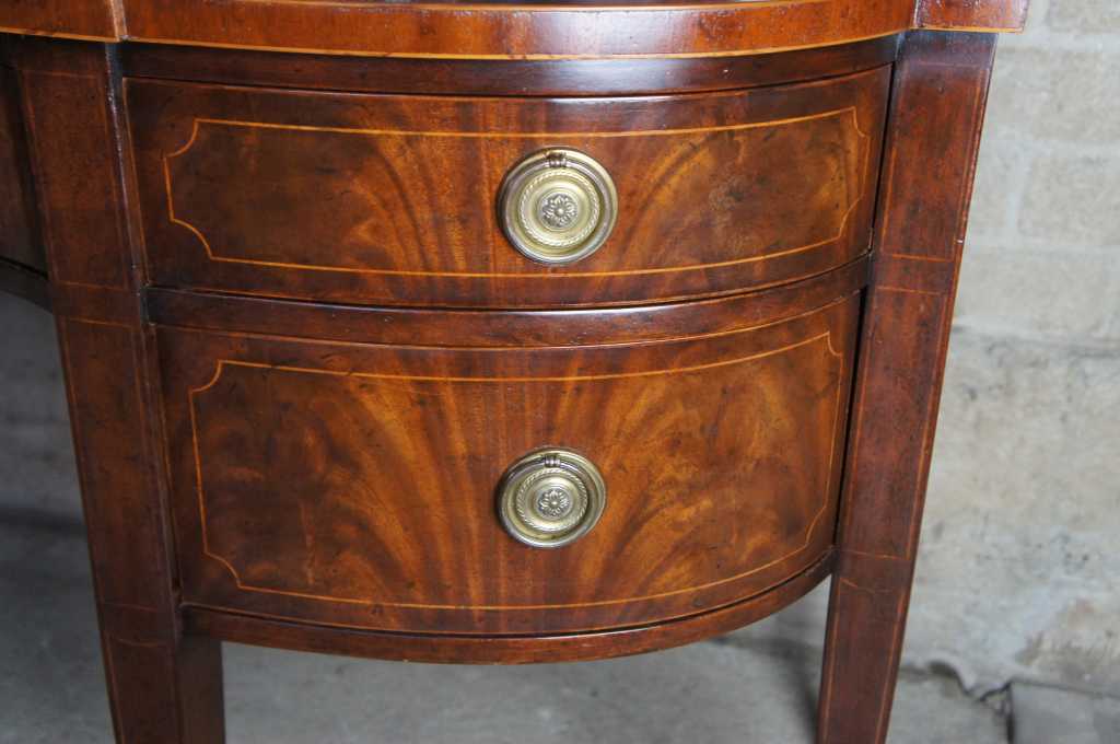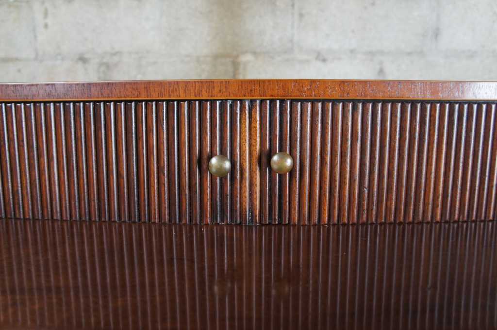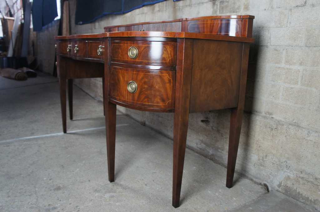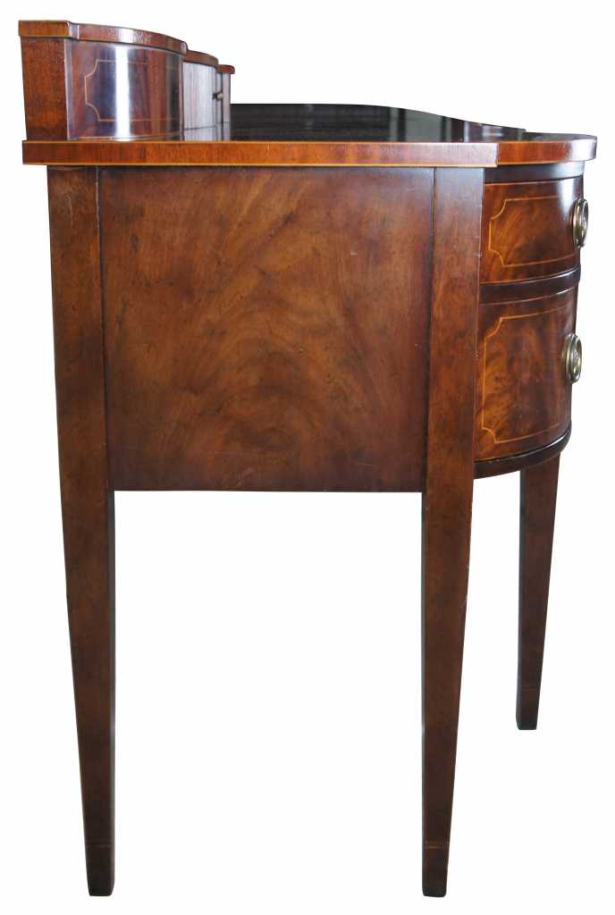 Monumental Baker Furniture serpentine sideboard. Made of mahogany with flame mahogay drawer fronts and inlaid accents. Features five drawers with brass hardware and a neat backsplash with two tambour doors. The sideboard is supported by six tapered legs.