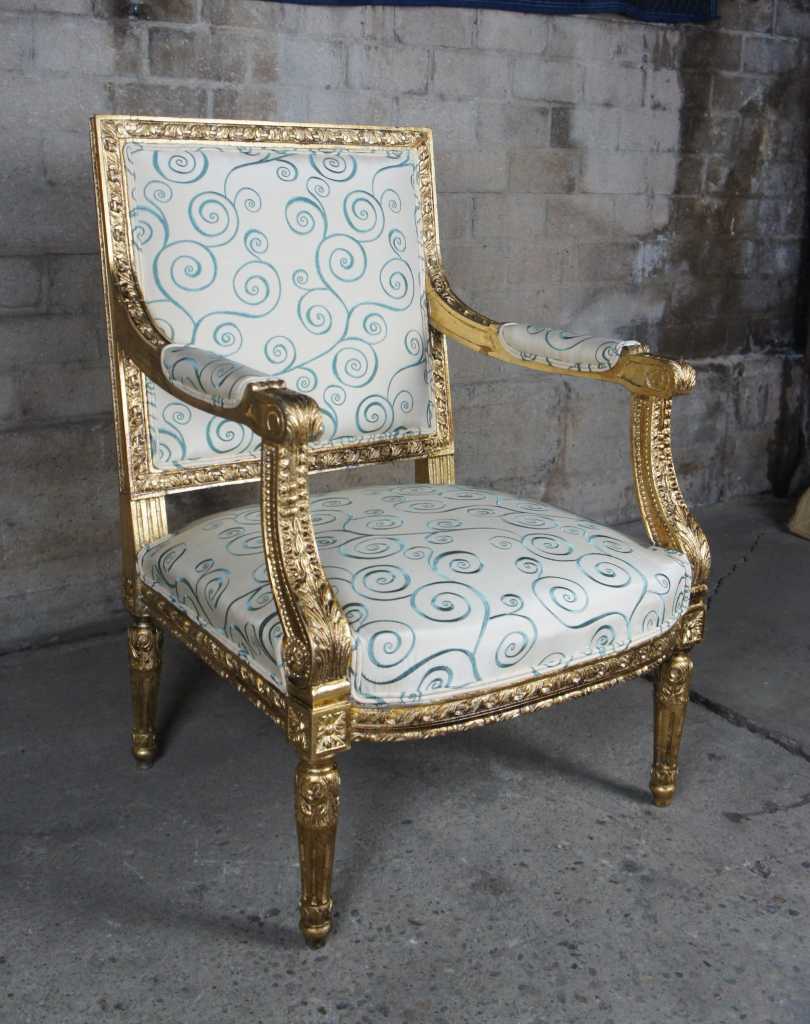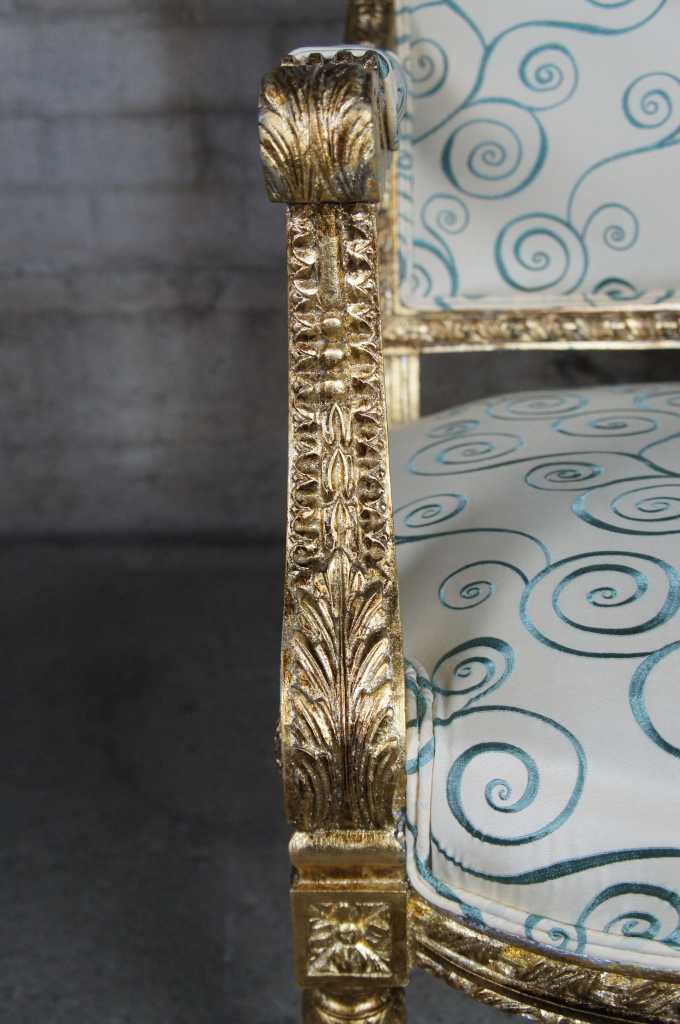 Late 19th century Louis XVI fauteuils. An ornate pair with modern upholstery, trimmed in gold with acanthus detail and traditional accents. A great pair of armchairs for any setting.