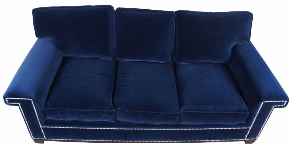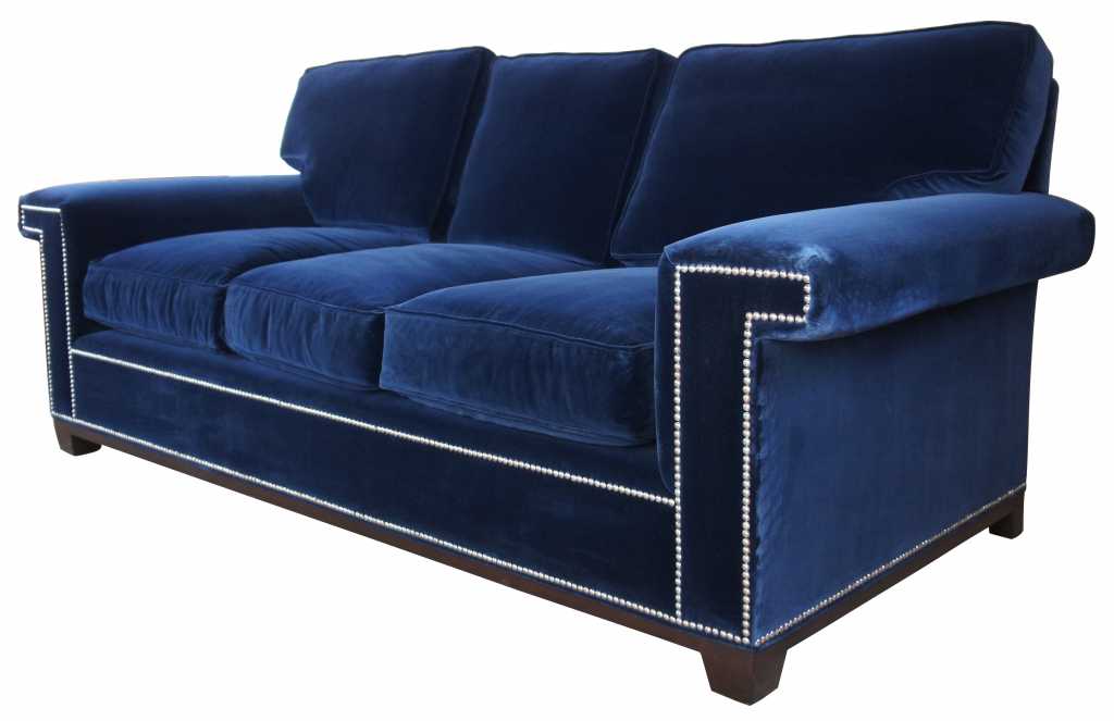 Barclay Buteras Paxton sofa; upholstered in a blue velvet with silver nailhead trim over a bracketed base.