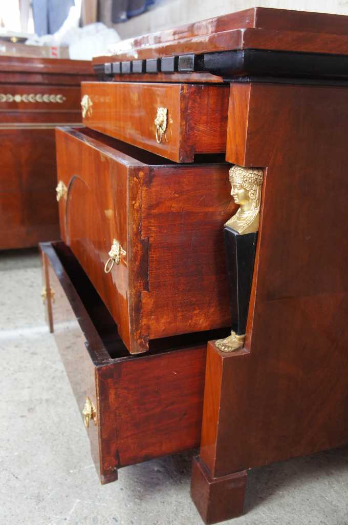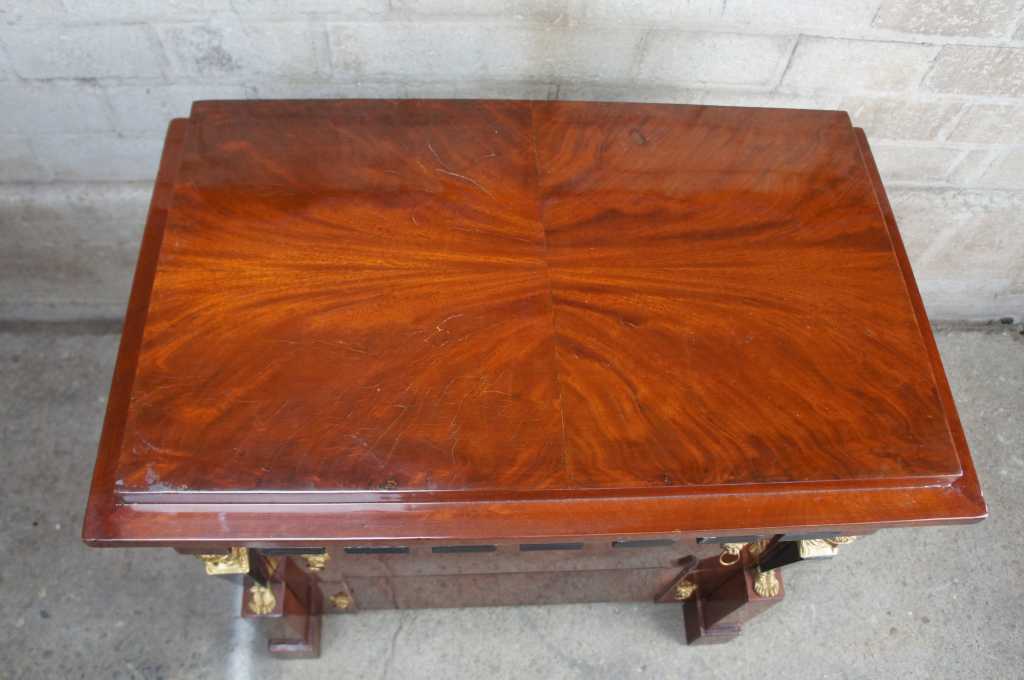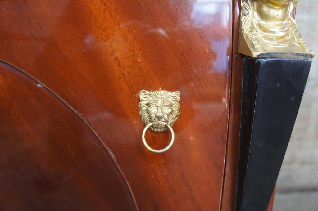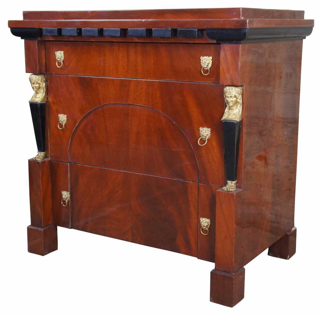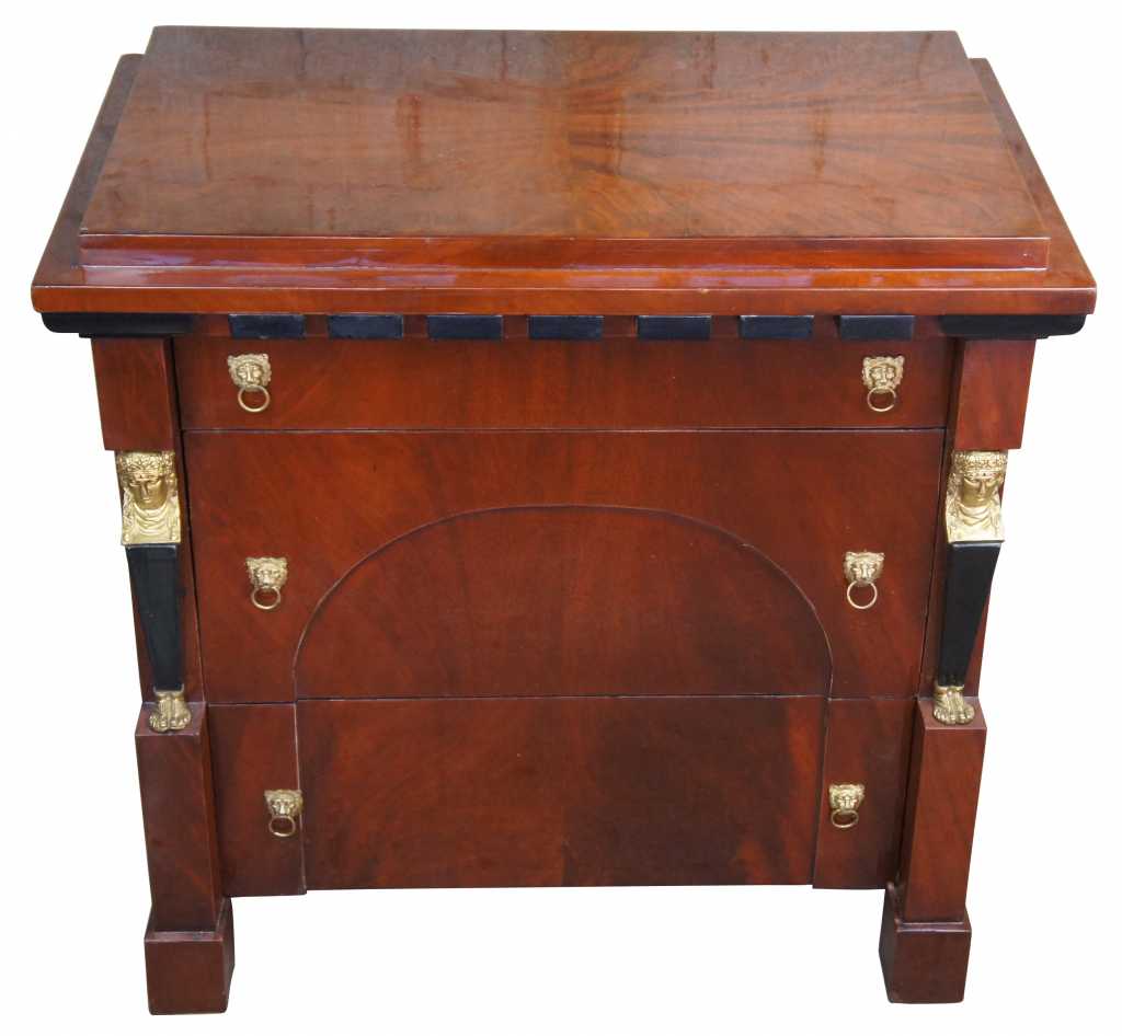 20th century Egyptian Revival three drawer chest. Made from mahogany with figural mounts and lion knocker drawer pulls. Features a blend of French and art deco styling. Perfect for use as a bedside table, dresser or stand alone piece. Matching table available with handpainted detail.