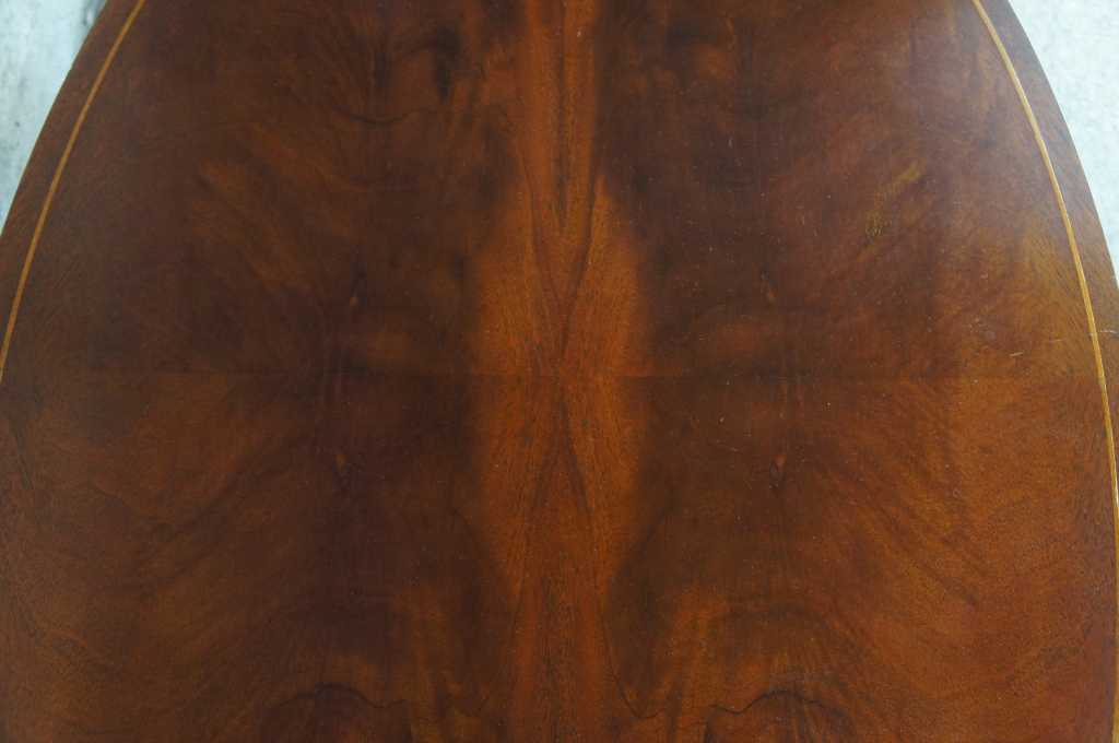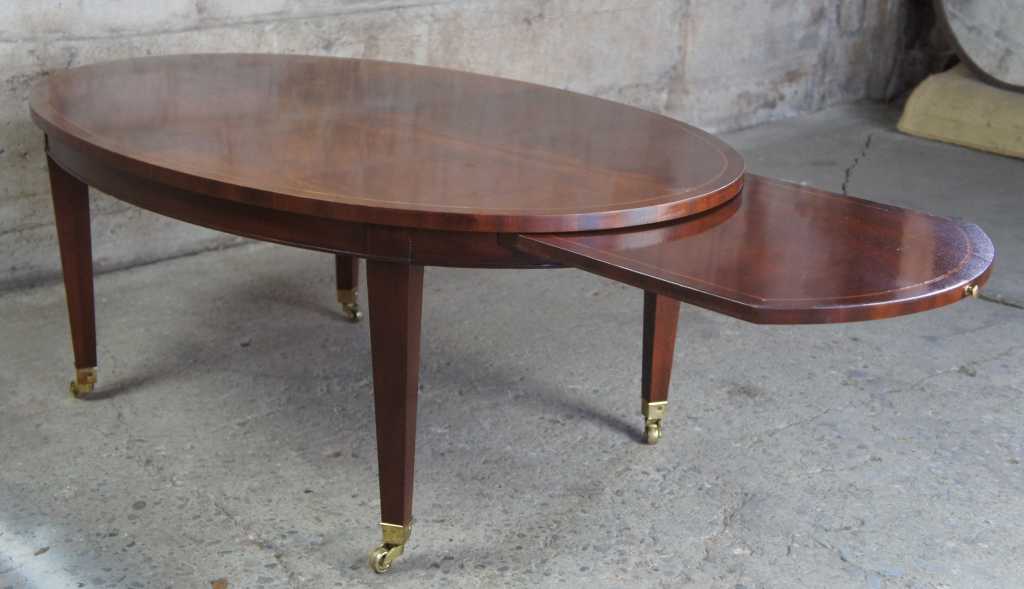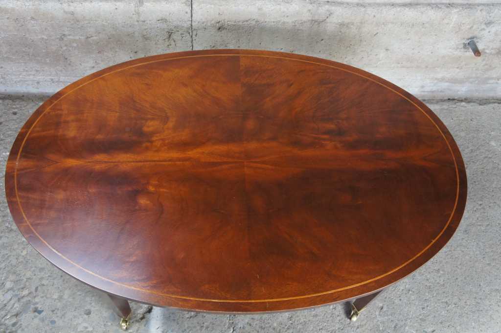 Baker Furniture Sheraton or Regency style coffee table. Oval shaped with flamed mahogany top, featuring inlaid band and large pull out leaves. The table is supported by tapered legs leading to brass caped castors.