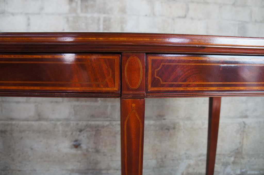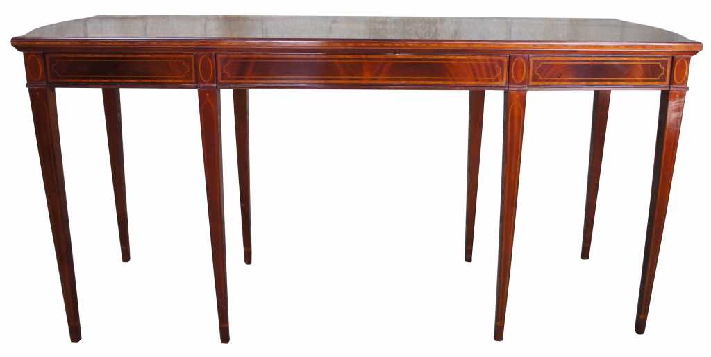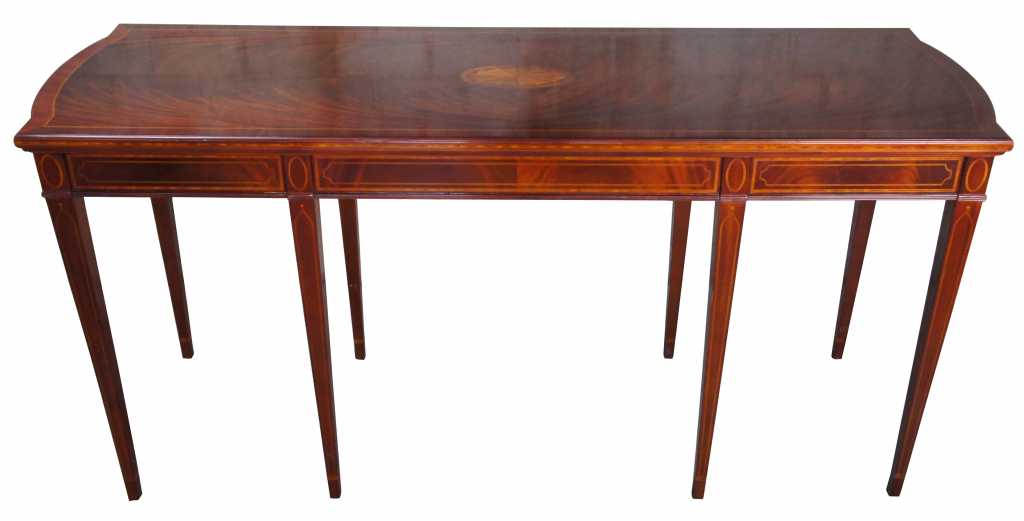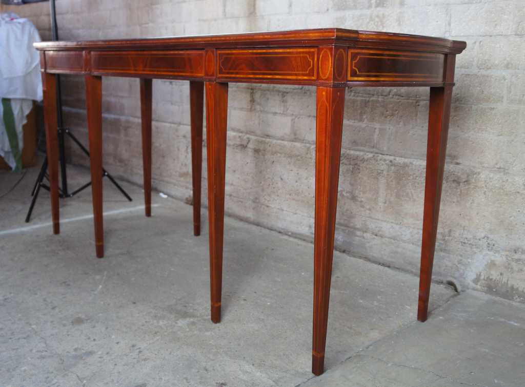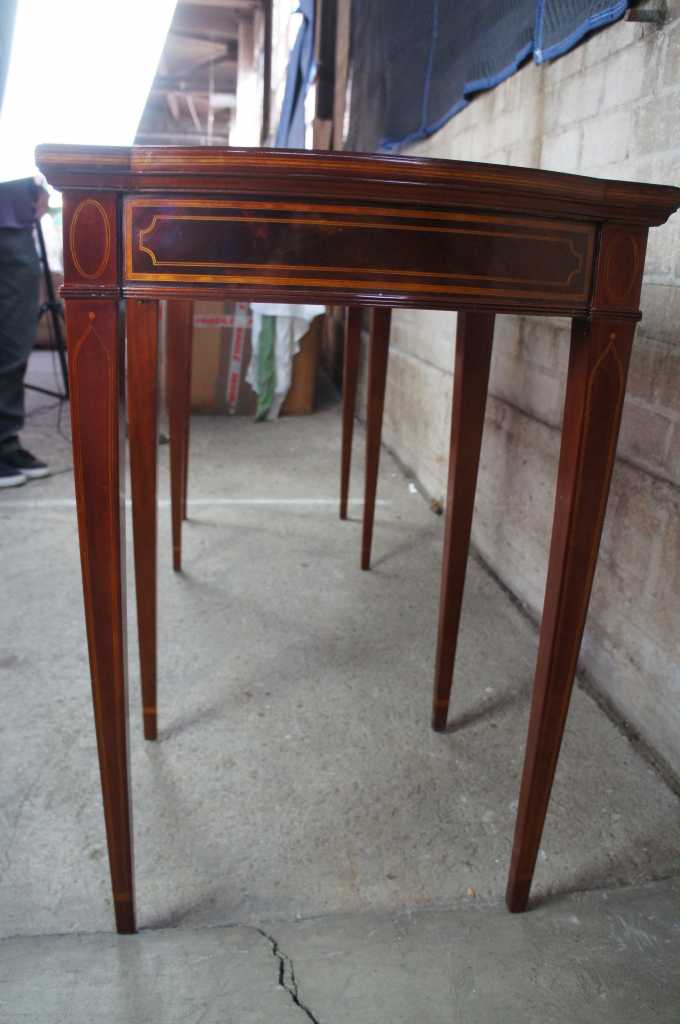 Late 20th century reproduction sheraton style console table. Made from mahogany with banding, inlay and flamed paneling. Rests upon eight tapered legs.