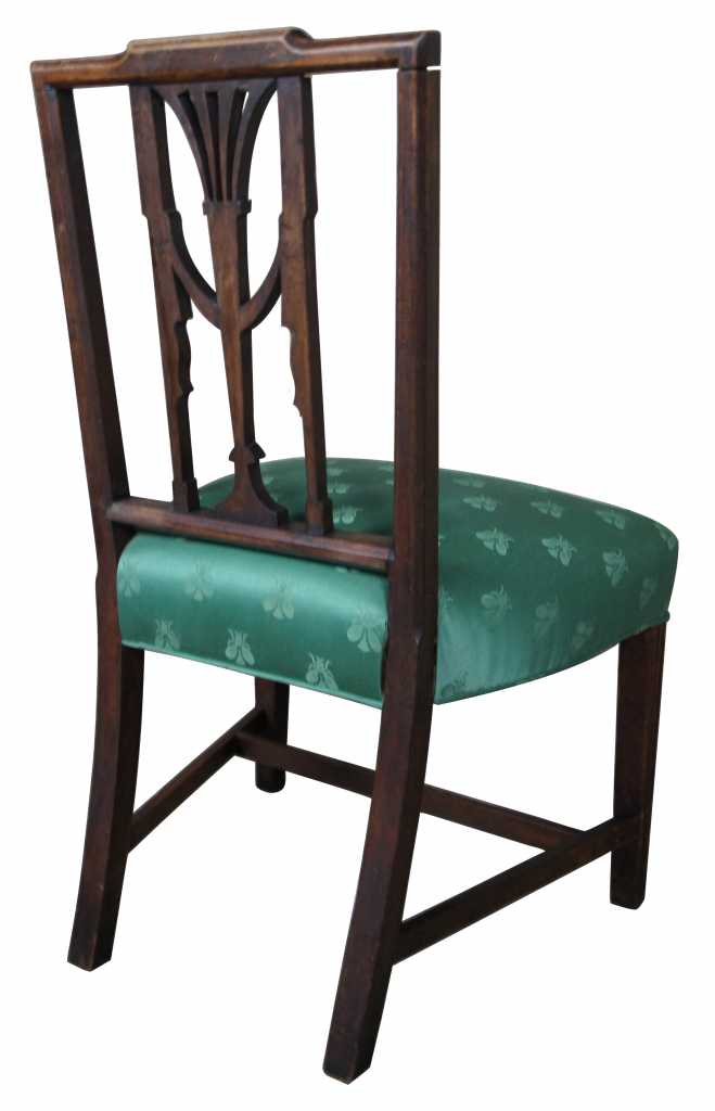 2 matching chairs, one antique and one vintage, Baker Furniture Hepplewhite Square back dining or side chair. Features mahogany wood with green silk fabric seat. Hepplewhite or Sheraton style, not to be confused with Federal, although they have similar characteristics.