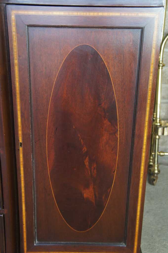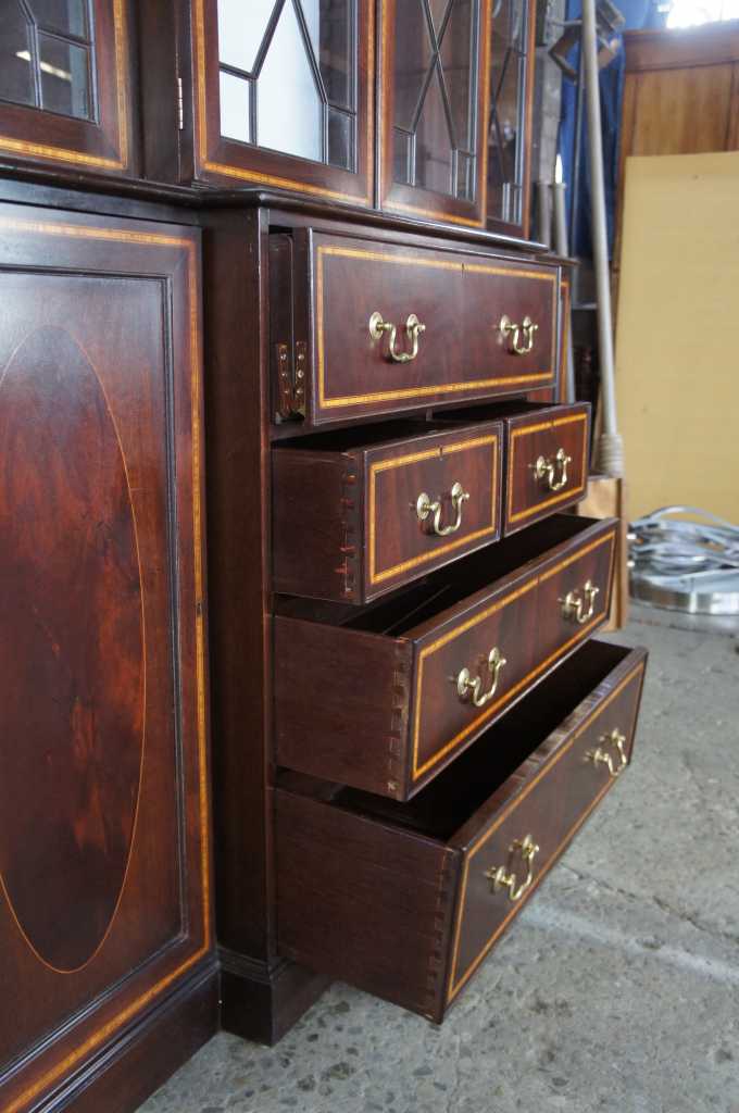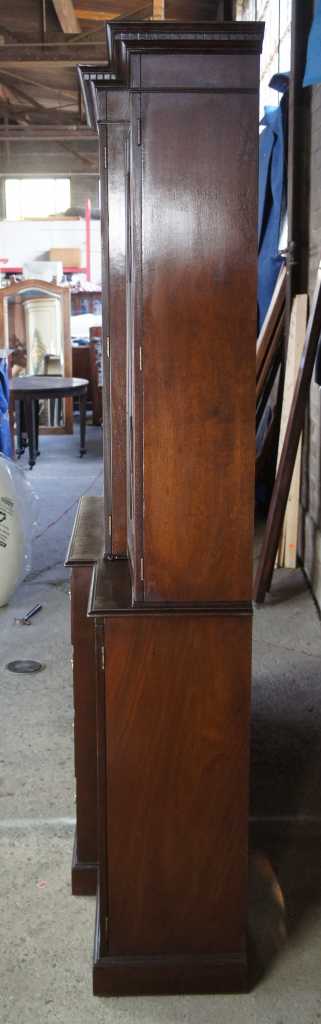 Custom made english breakfront. Made from mahogany with banding and walnut burled lower doors. The bookcase features fretwork over the glass doors with the interior lined/finished in French raised florish wallpaper. Lower portion of cabinet features a drop front leather secretary that opens to cubbies and drawers. Includes tooled leather writing surface, three additional drawers and outer cabinets with shelves, and functional locks with key.