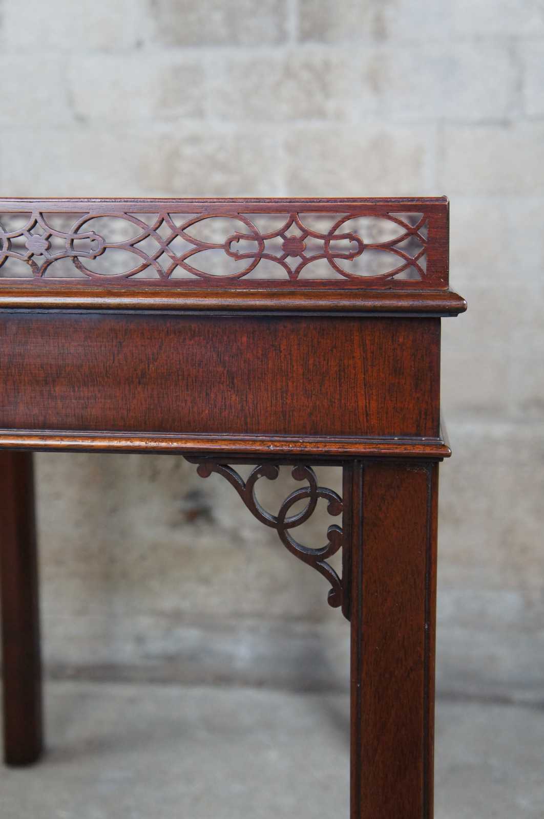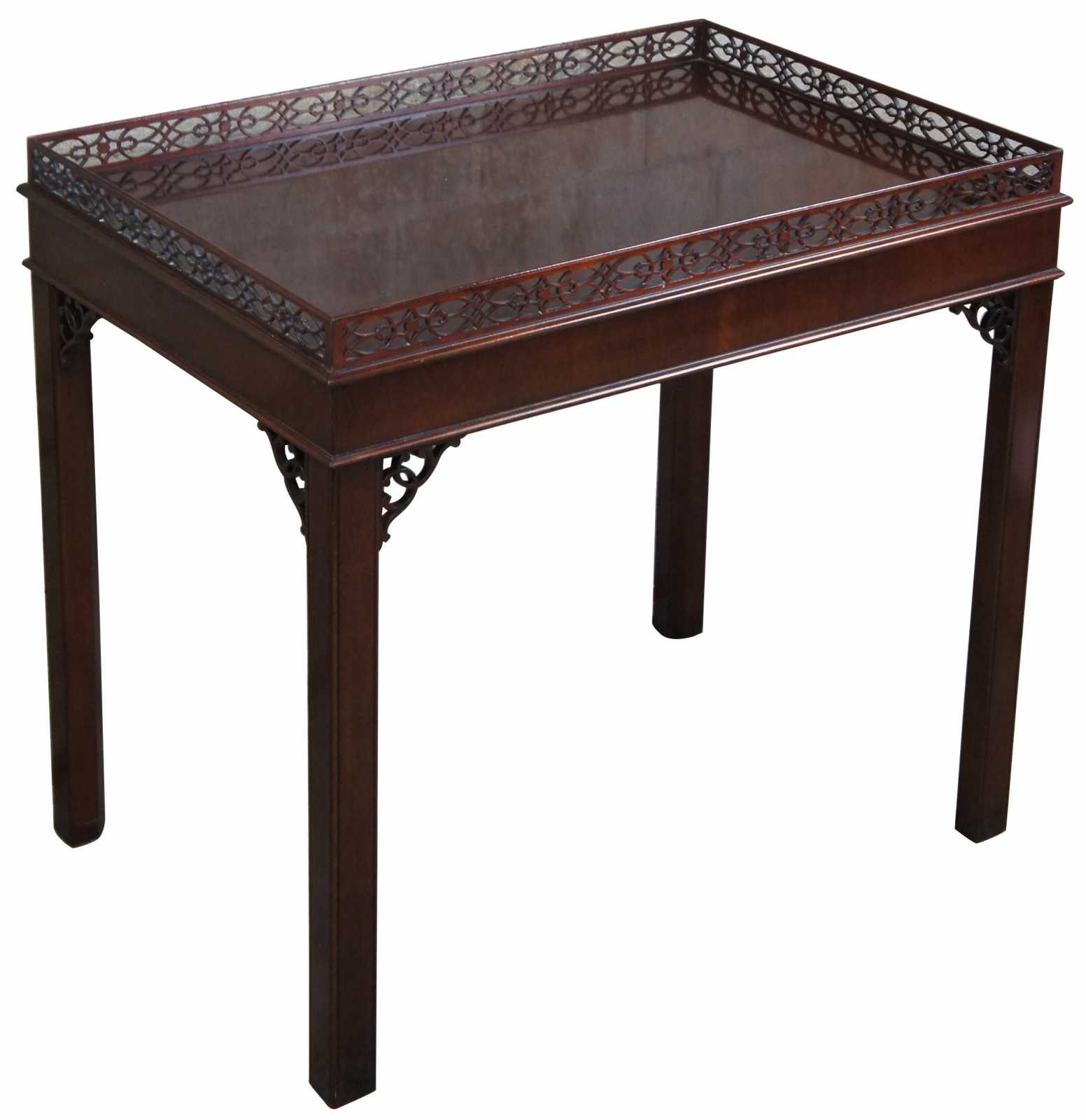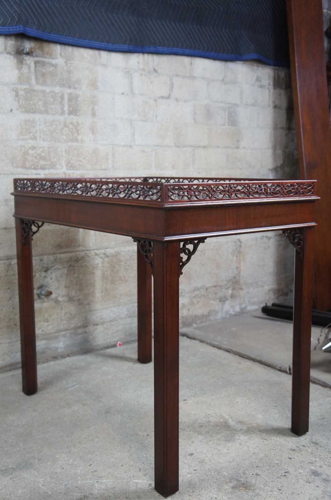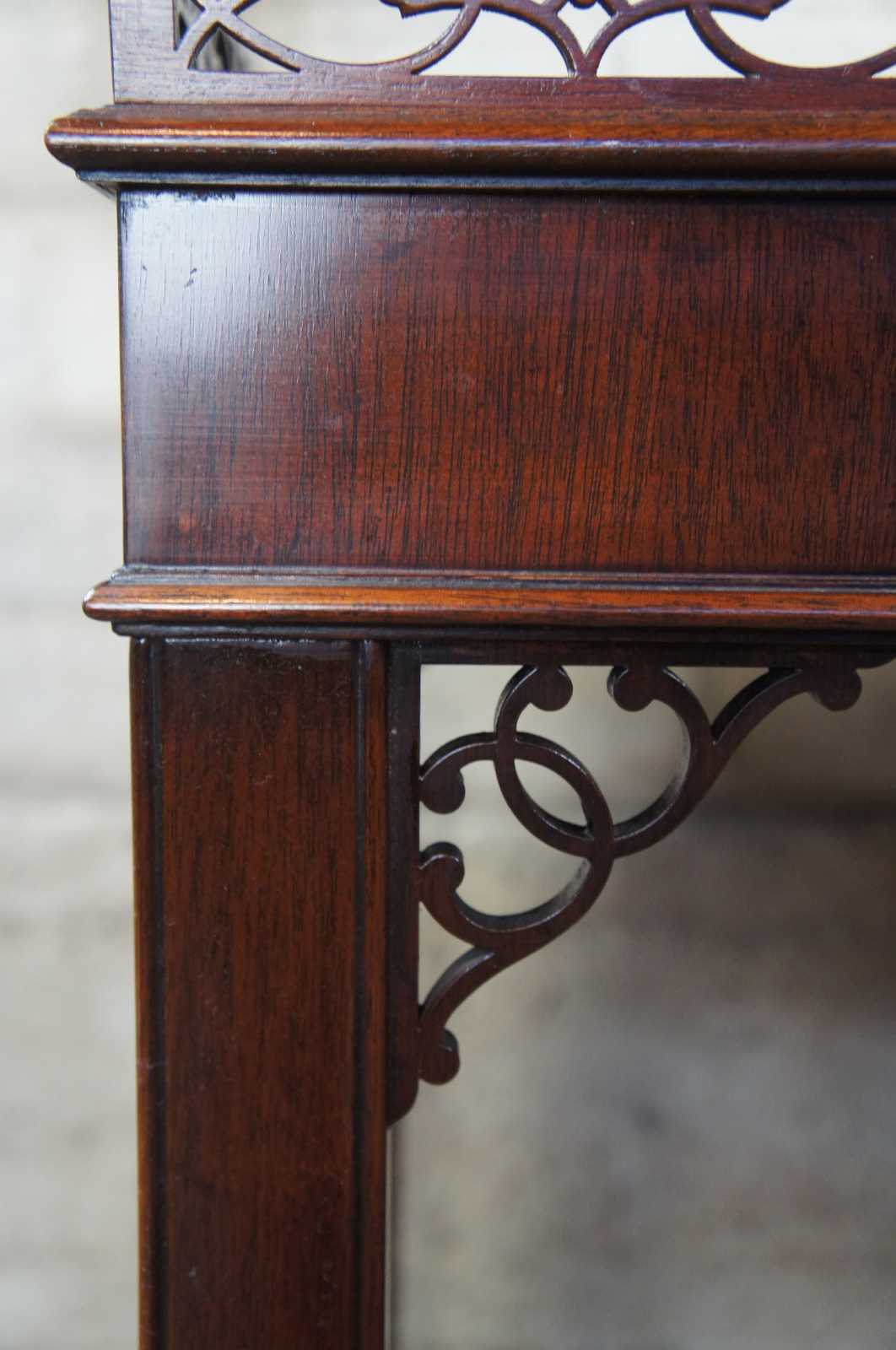 Kindel chippendale style carved mahogany table in Oxford finish. Features ornate fretwork and carvings.