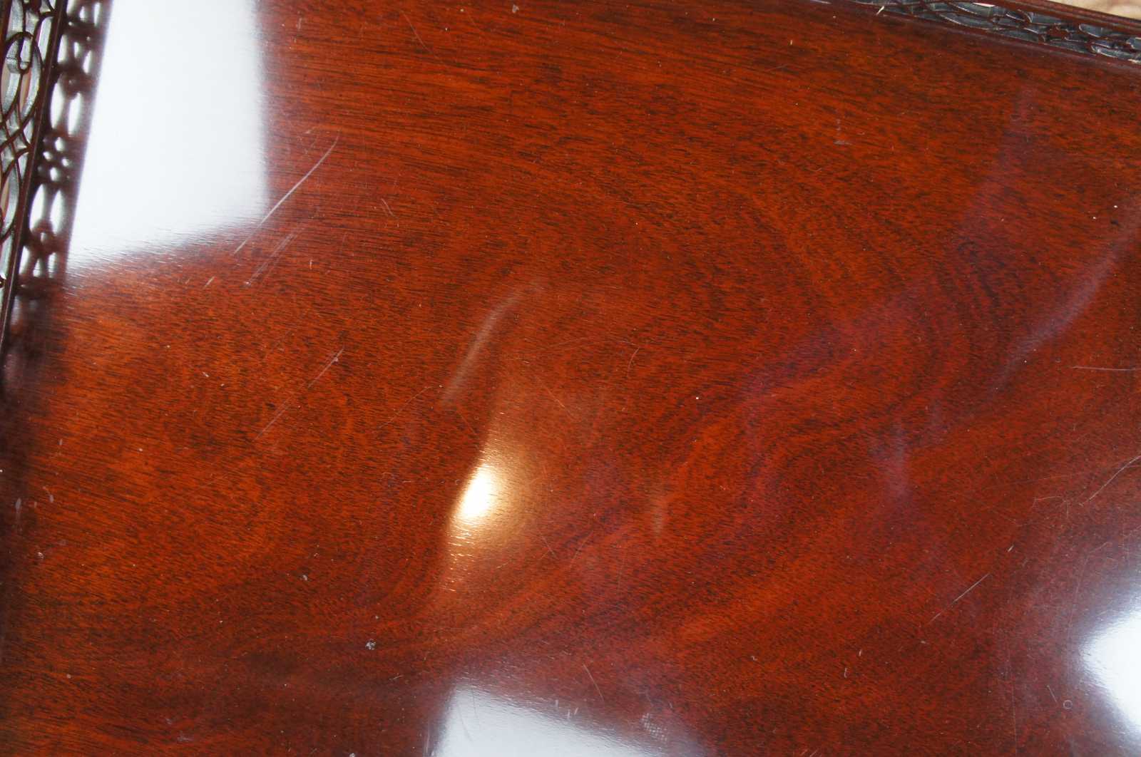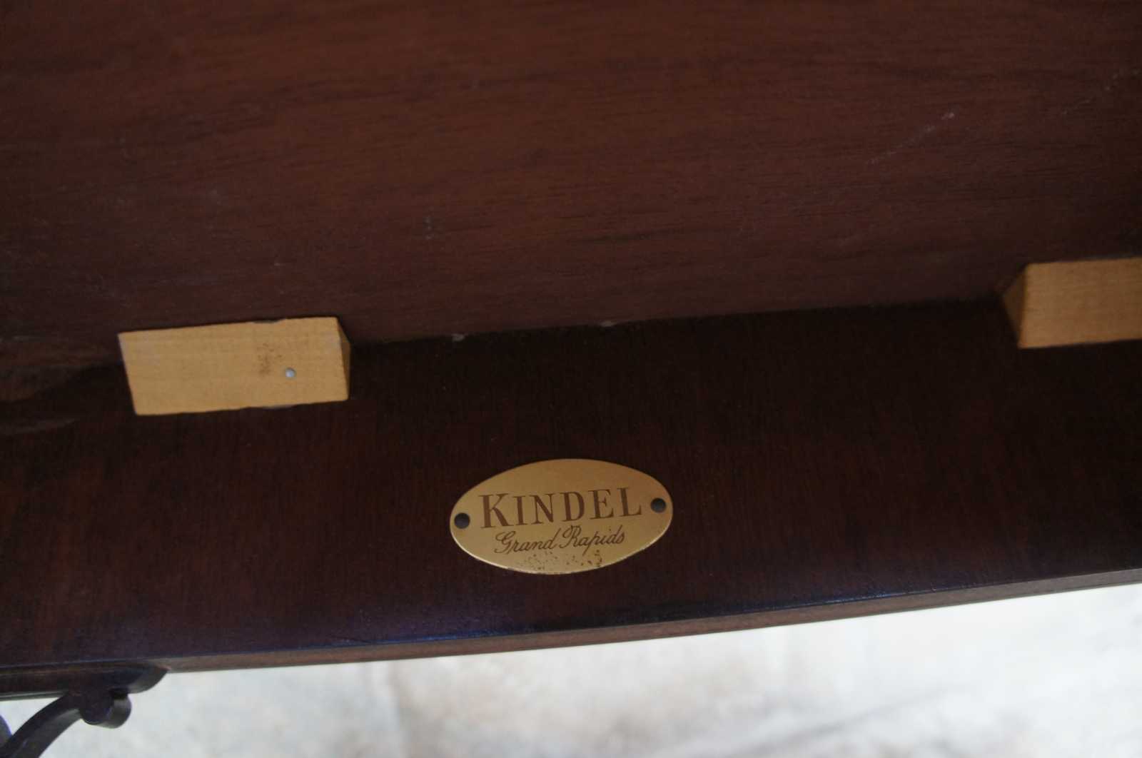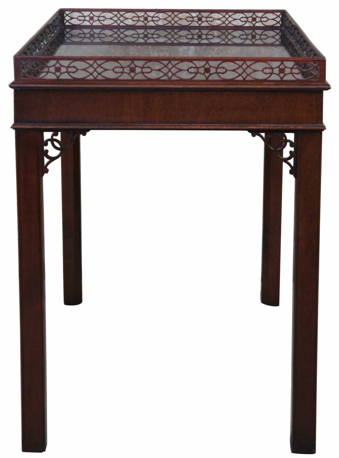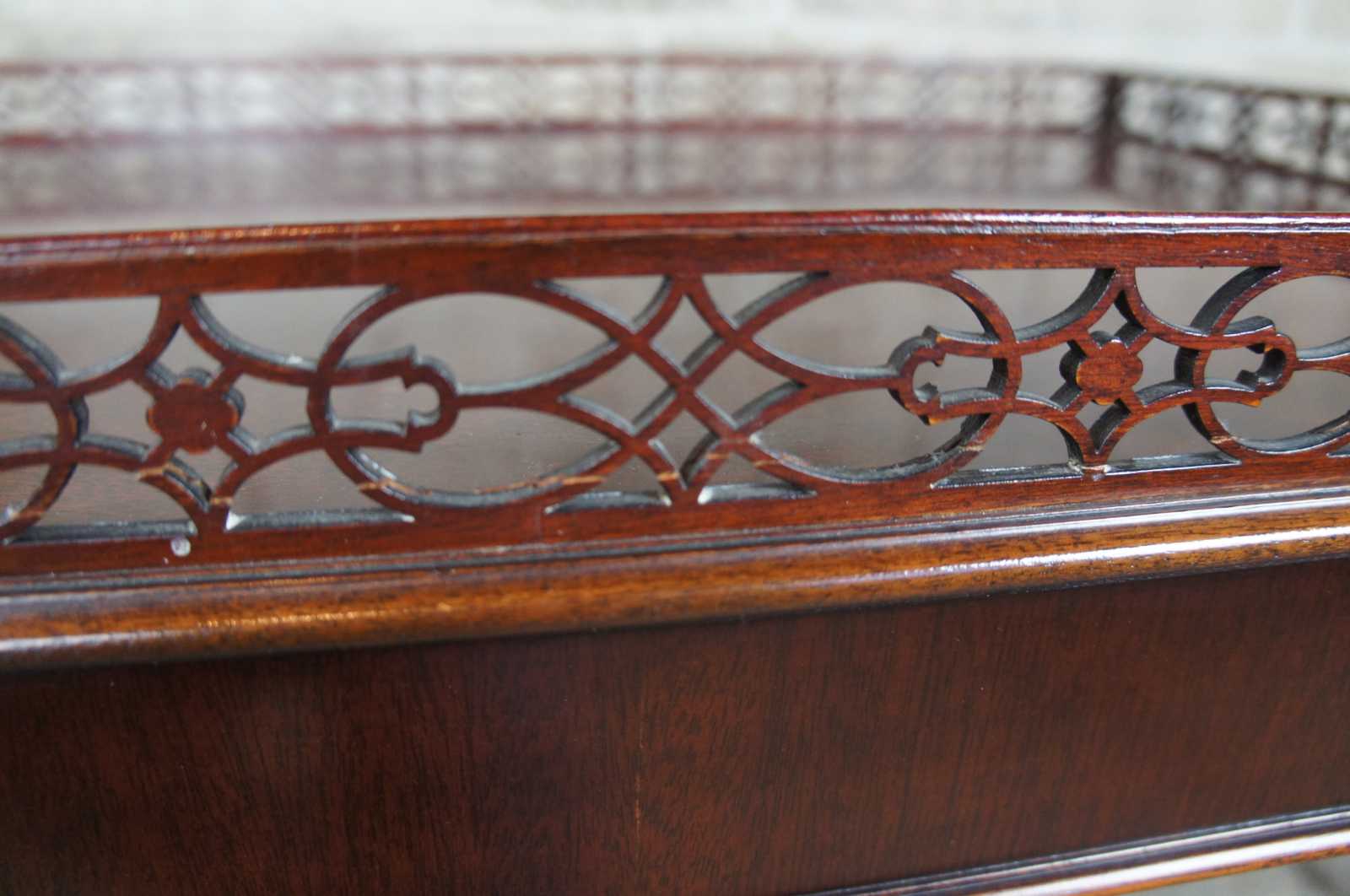Kindel chippendale style carved mahogany table in Oxford finish. Features ornate fretwork and carvings.