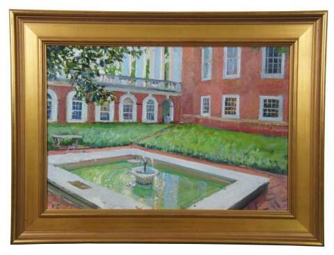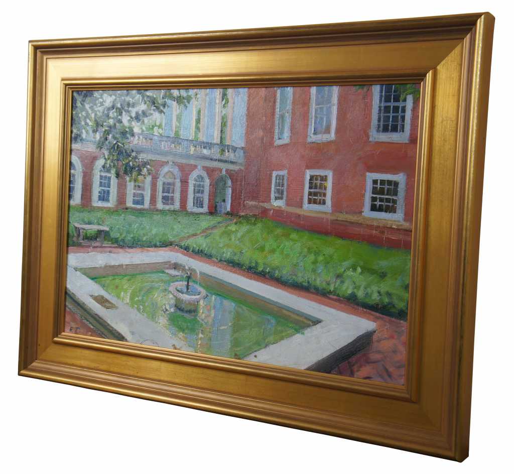 Oil on Board Landscape Painting by Edward Thomas. Features the Dauden Fountain, east cortyard at the University of Virgina (UVA) in 2009. Bio: Edward Thomas is an artist, architect and historian living and working daily in Charlottesville, Virginia. Edward studied both architecture and painting at the University of Virginia. He paints out of door scenes daily and continues his passion for building by using his downtown home as a perpetually unfinished architectural laboratory. Edward specializes in brick masonry and classical methods of building that were used by Thomas Jefferson and other architectural styles vernacular to the region. Edward's original paintings are found in prestigious collections throughout the US. He is now offering select pieces to be reproduced as limited edition signed prints, as well as a gift shop featuring his work.