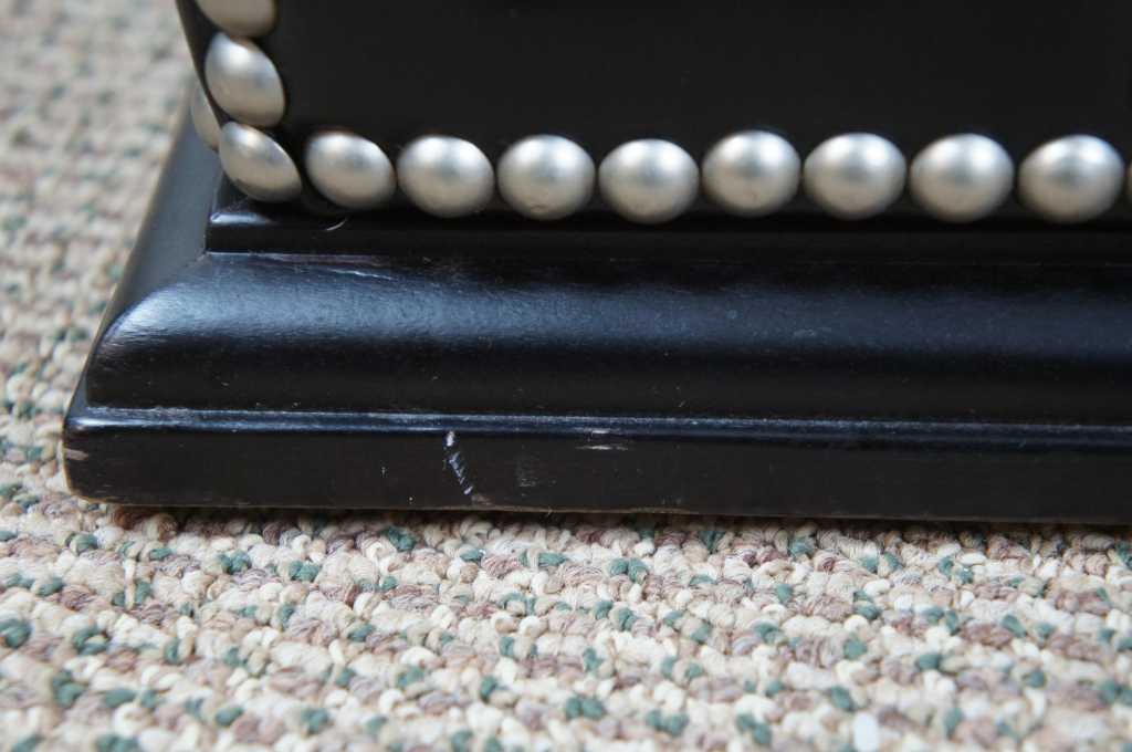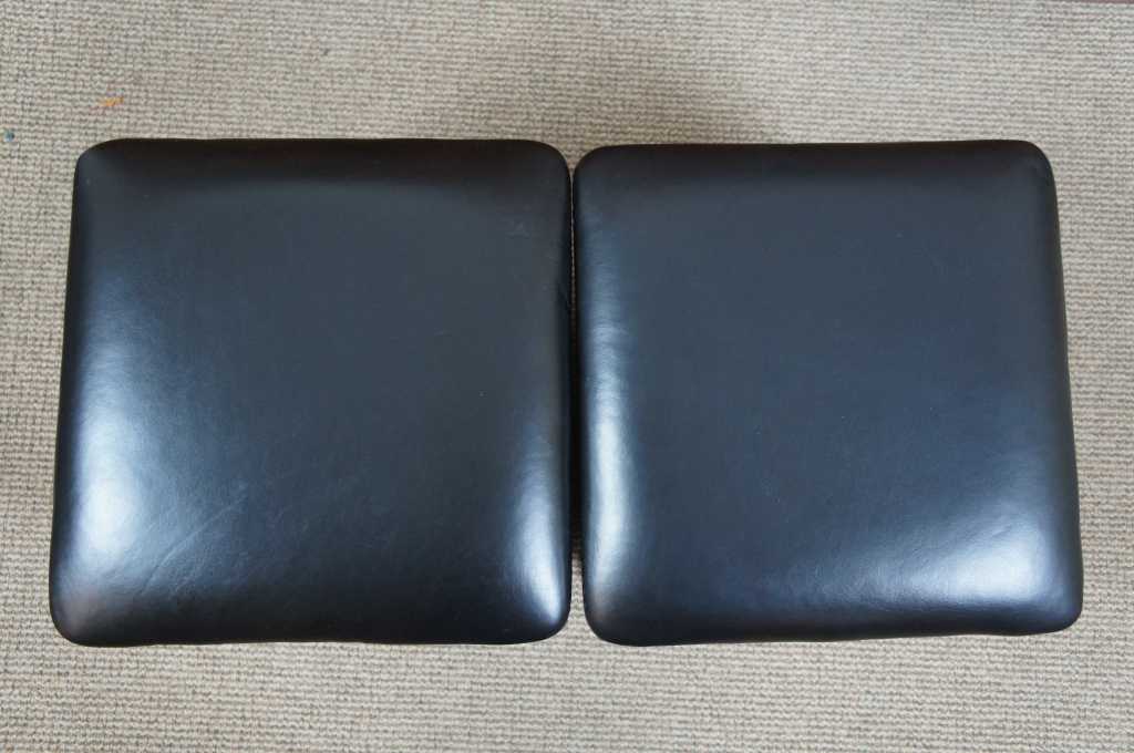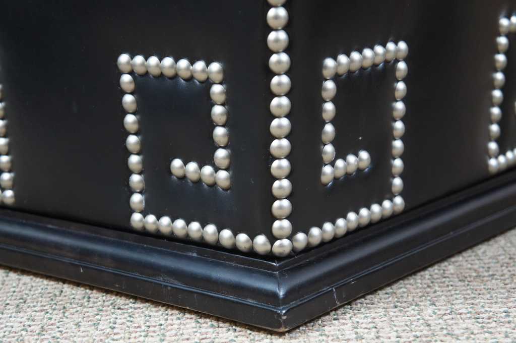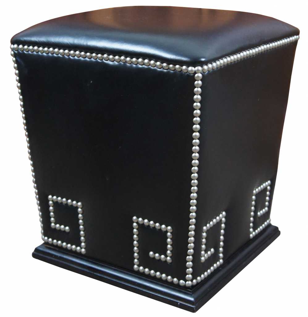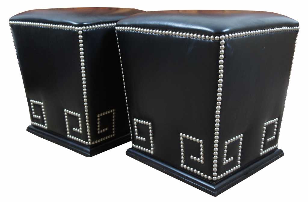 Pair of two Lee Industries "Natural Lee" black leather nailhead Bongo leather ottomans. Feature Greek key motif over black leather and a wooden base. Traditional style, style #9045-00