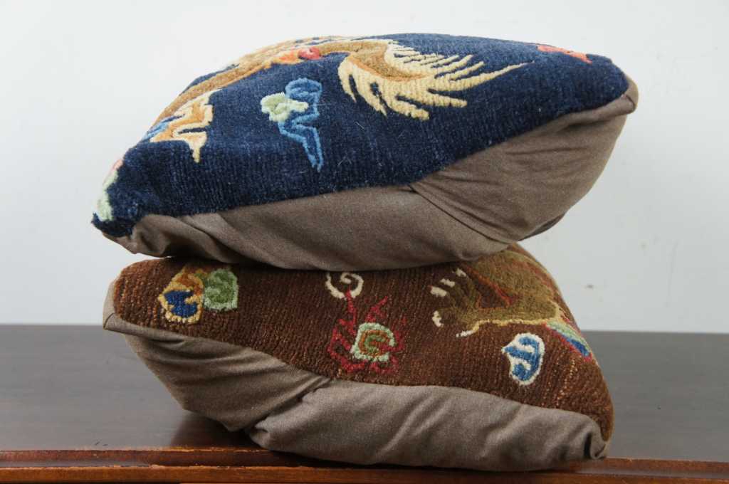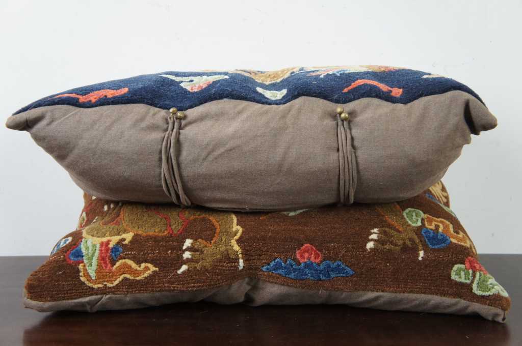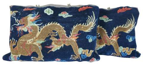 Chinese Dragon Pillows, featuring imperial dragons on fields of brown and blue, with cloud designs. Finished with brass hardware, pillow insert included. One pillow is marked Marshal and the other Threeline.