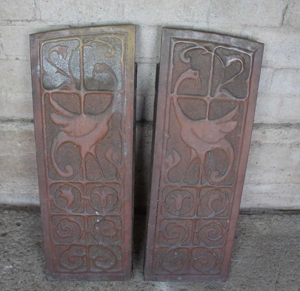 Antique stamped copper fireplace screen. Features swans, cats and outer crests with an "S". Floral design throughout. Each copper panel is mounted to oak boards with a hinge.