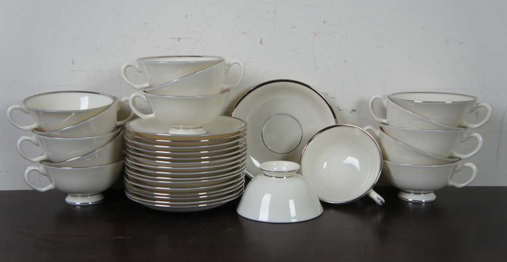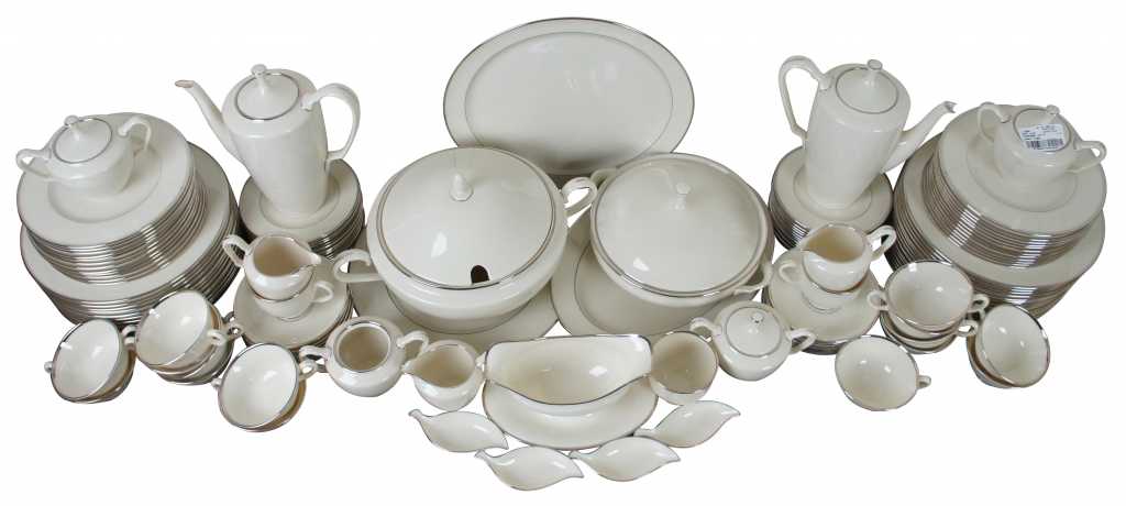 Large Round Platter - 12.75” x 0.75” / Medium Round Platter - 12.125” x 0.75” / Soup Tureen w/ Lid - 14” x 10” x 8” / Oval Platter - 13.75” x 10” x 1.125” / Serving Dish w/ Lid - 11” x 9” x 5.75” / 30 Dinner Plates - 10.75” x 0.75” / 2 Teapots - 8.75” x 4.5” x 9.5” / 24 Salad Plates - 8.25” x 0.5” / 24 Bread Plates - 6.5” x 0.5” / 3 Coffee Cups - 3.375” x 2.75” / 3 Creamers - 4.75” x 3.25” x 3.5” / Gravy Boat - 8.5” x 6” x 4.25” / 16 Saucers - 5.75” x 0.75” / 4 Sugar Bowls w/ 3 Lids - 6” x 4” x 4.5” / 4 Bone Dishes - 5” x 2.25” x 1” / 15 Teacups - 4.25” x 2” (Diameter x Height/Width x Depth x Height)