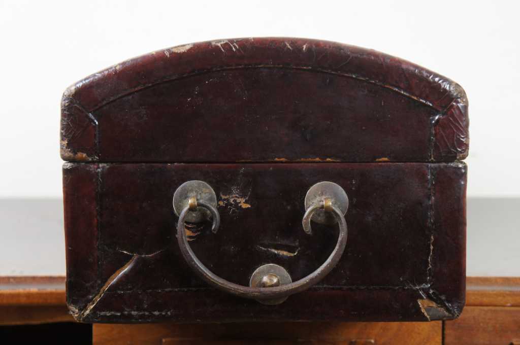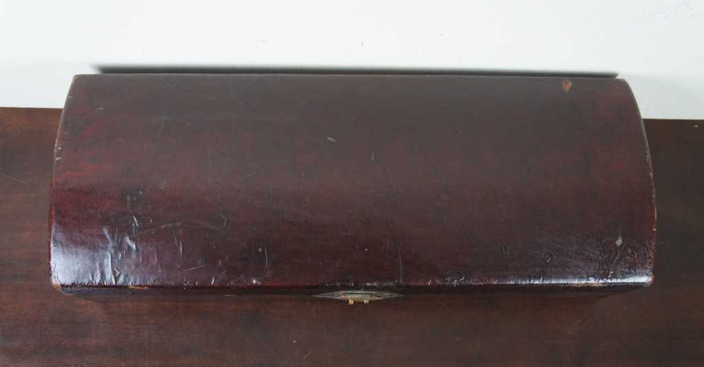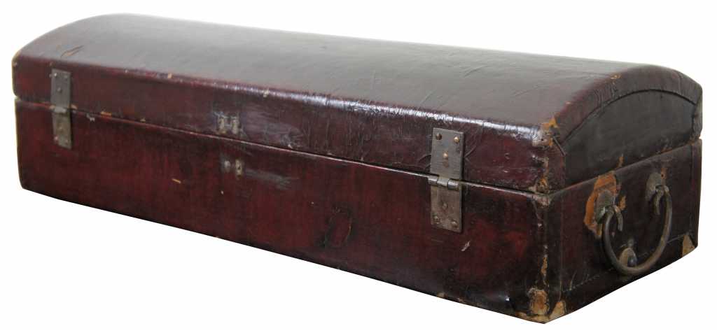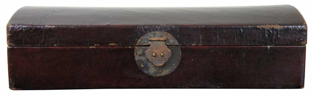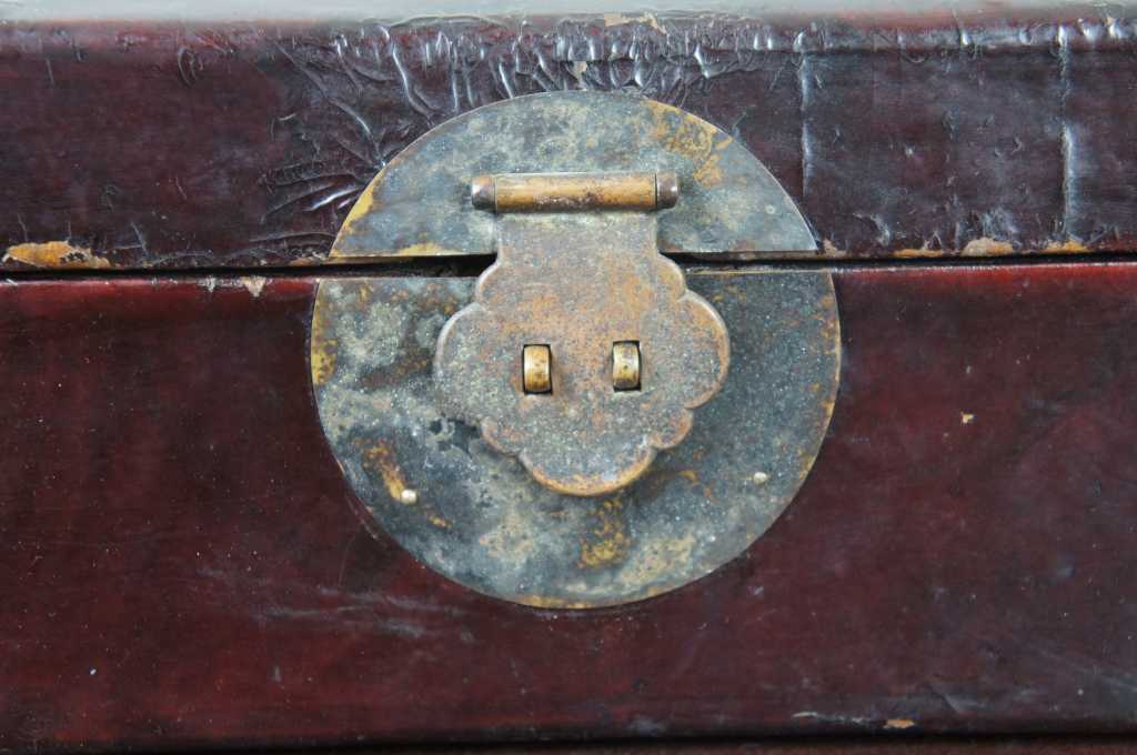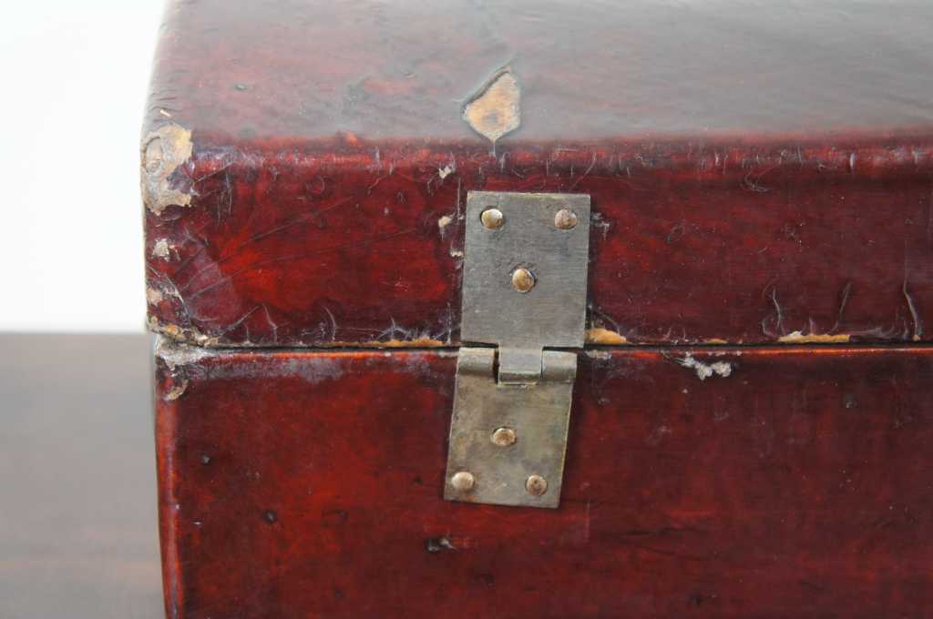 Handmade Antique Chinese Leather Scroll Box Trunk Chest Lacquer Handled Domed