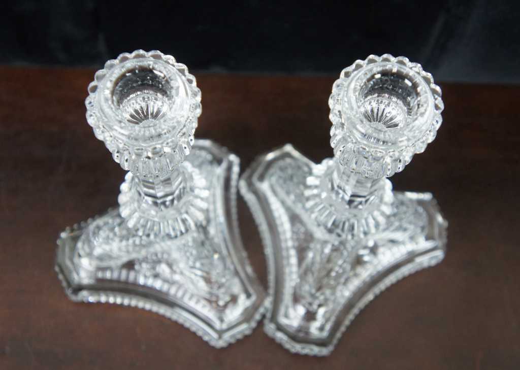 Tiffany crystal candlesticks, features a tripod base with dolphins.