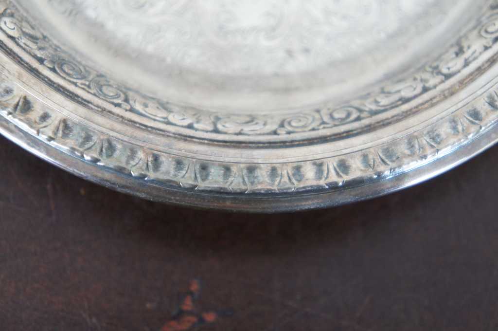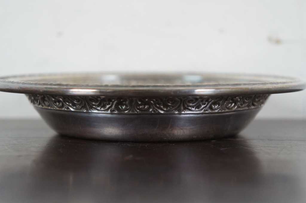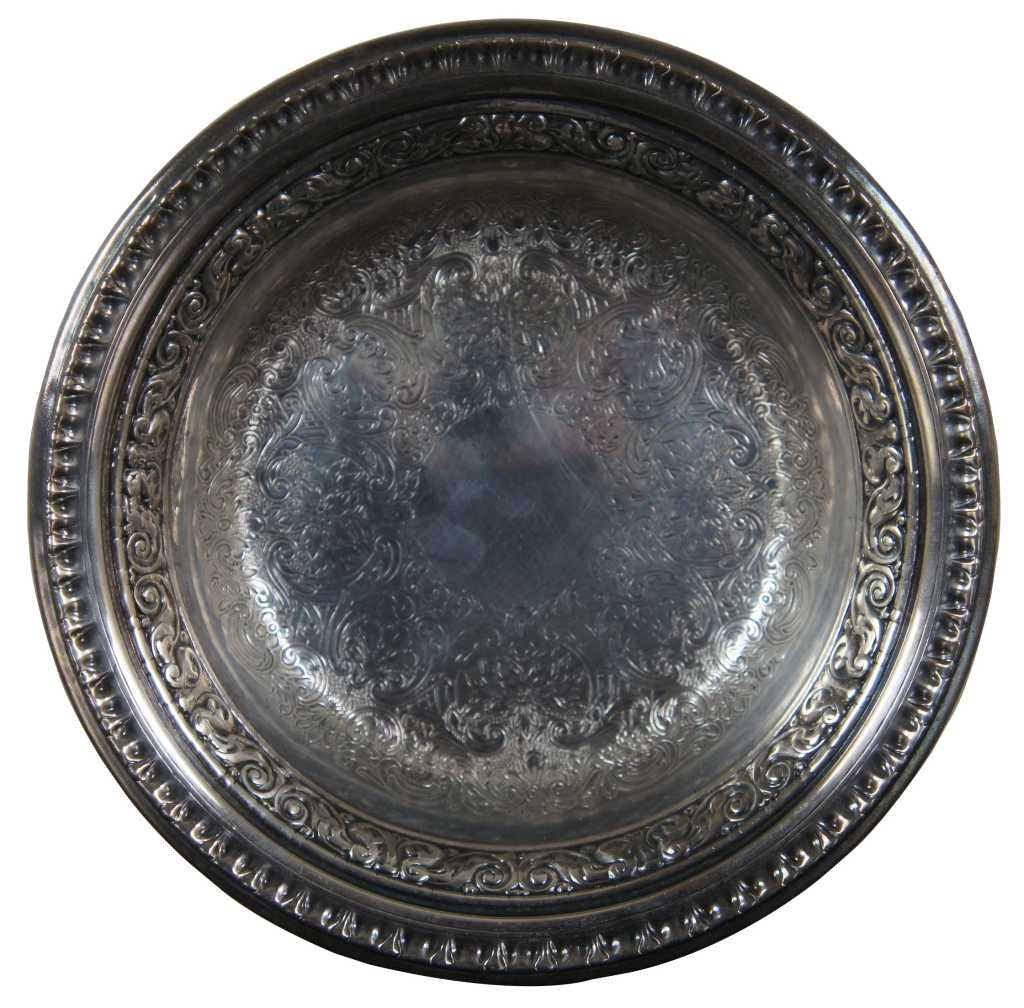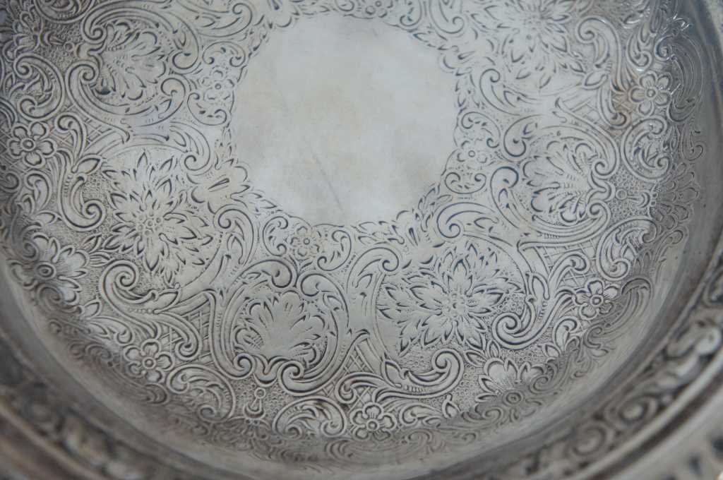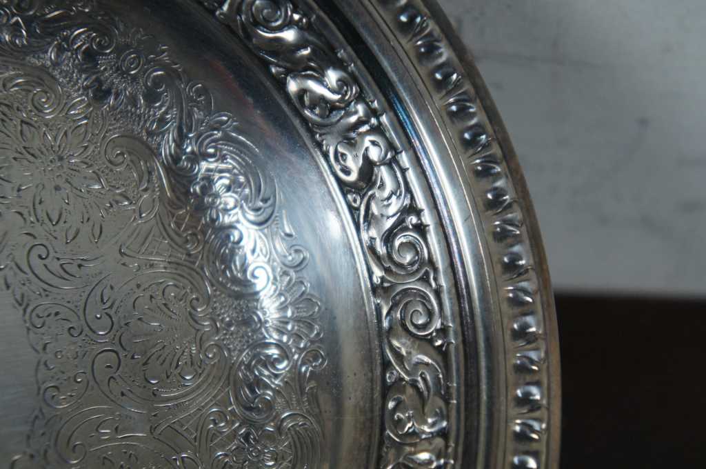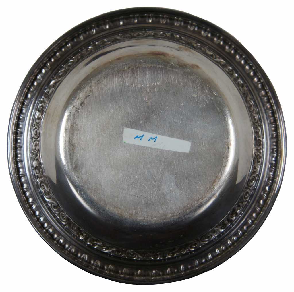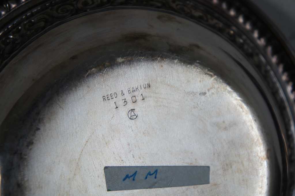 "Reed & Barton Victorian style bon bon dish (candy compote). Features ornate embossed floral & reposse scalloped design. The Reed & Barton story began in 1824, with Isaac Babbitt in his Taunton, Massachusetts pewter shop. He joined forces with craftsmen Henry G. Reed and Charles E. Barton to produce higher quality pewter ware.