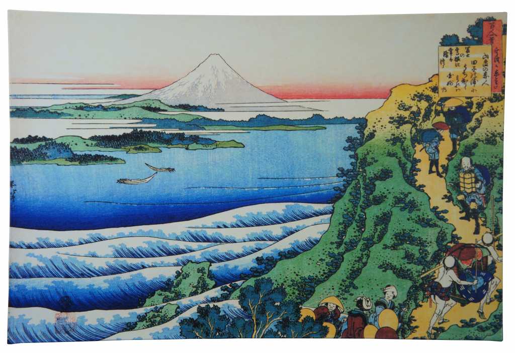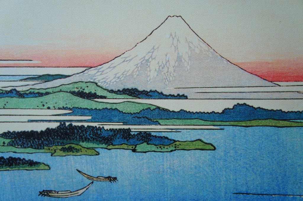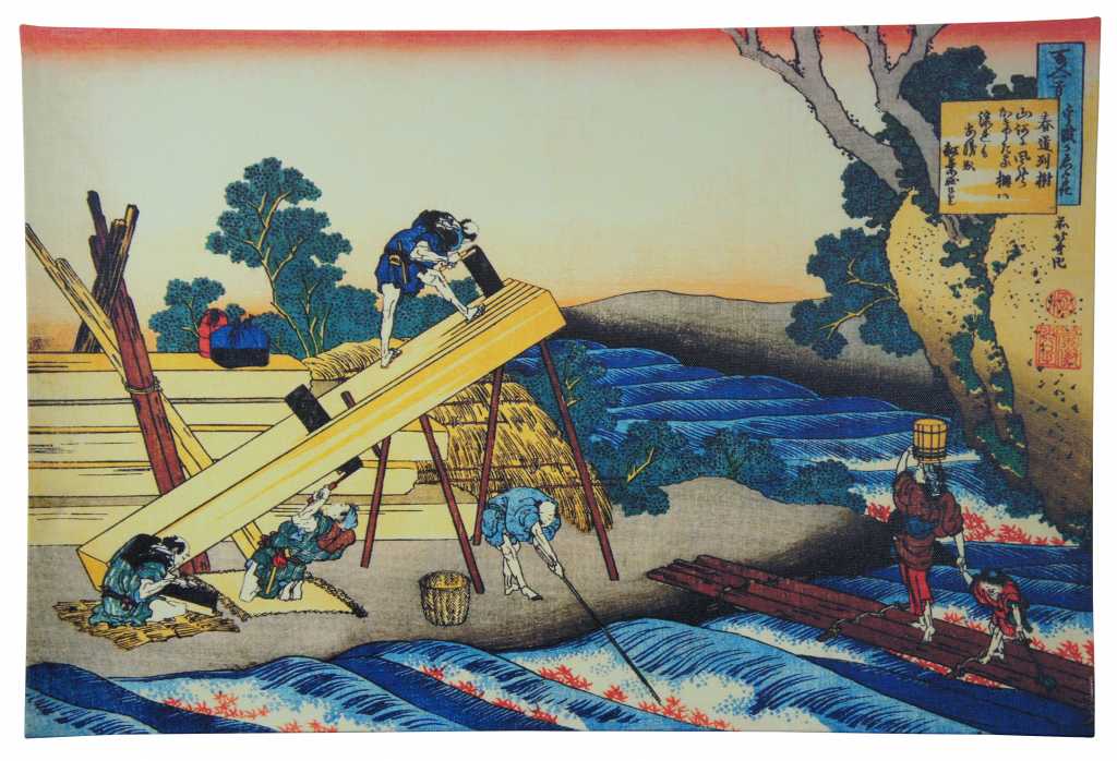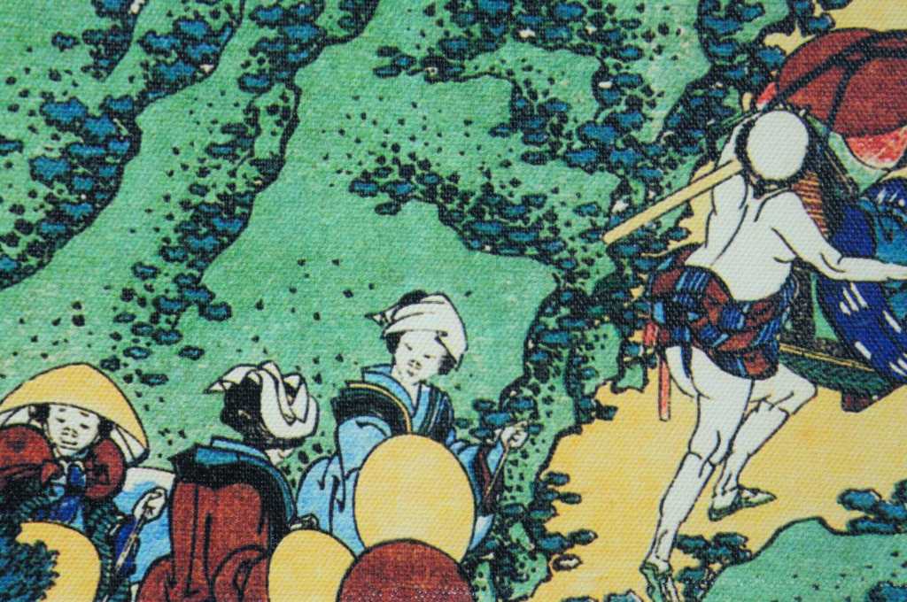 Colorful pair of Japanese style art prints on canvas. Made in USA. Features workers cutting and carrying supplies up mountainside. Mt Fuji can be seen in background.