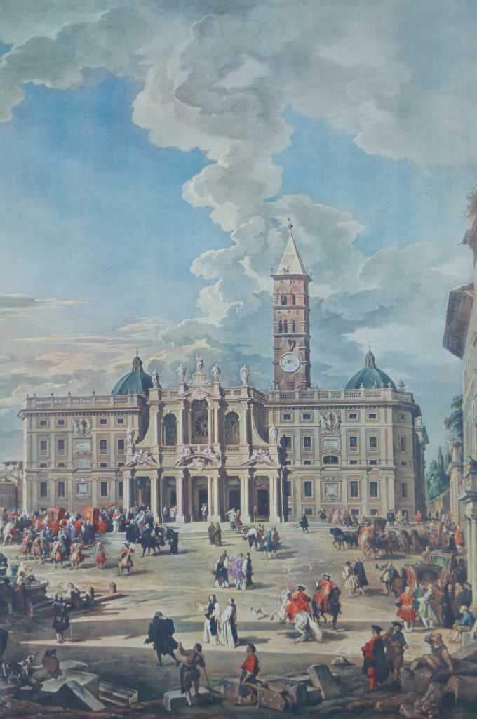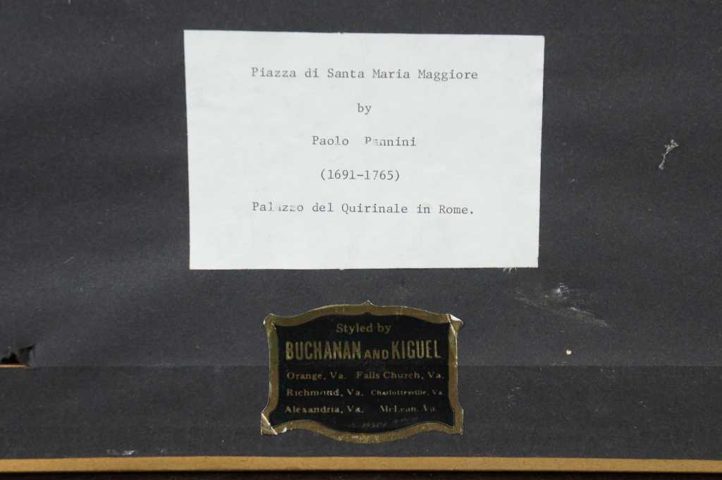 Antique colored engraving of Piazza di Santa Maria Maggiore by Giovani Paolo Pannini. The Palizzo del Quirnale in Rome Italy. Giovanni Paolo Panini or Pannini (17 June 1691 - 21 October 1765) was a painter and architect, who worked in Rome and is mainly known as one of the vedutisti (""view painters""). As a painter, Panini is best known for his vistas of Rome, in which he took a particular interest in the city's antiquities. Among his most famous works are his view of the interior of the Pantheon (on behalf of Francesco Algarotti), and his vedute—paintings of picture galleries containing views of Rome.