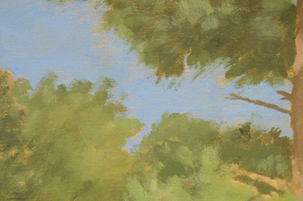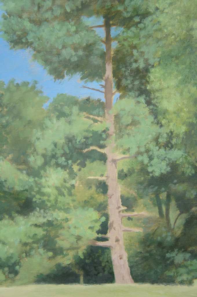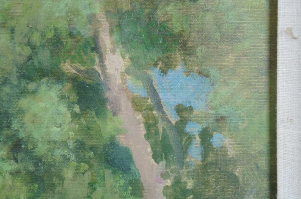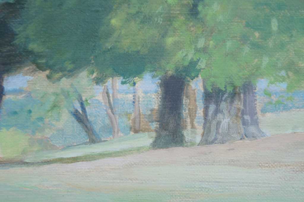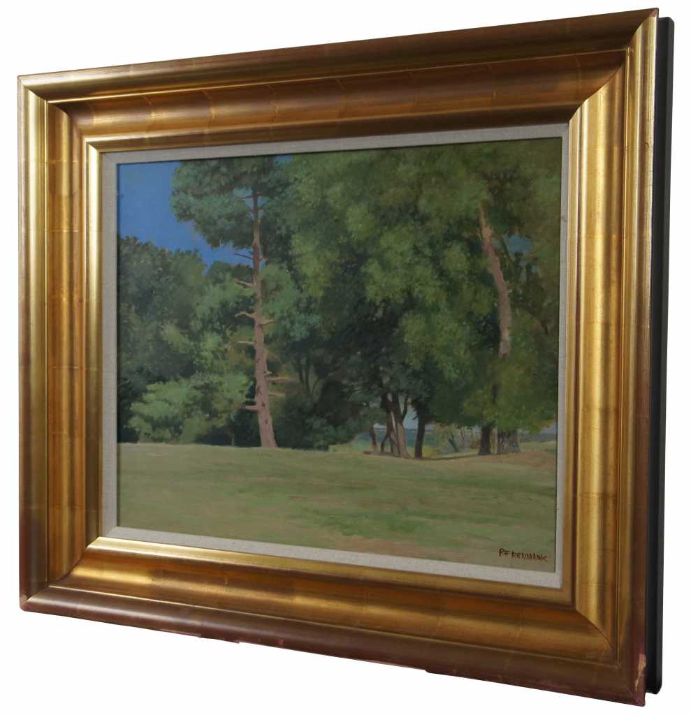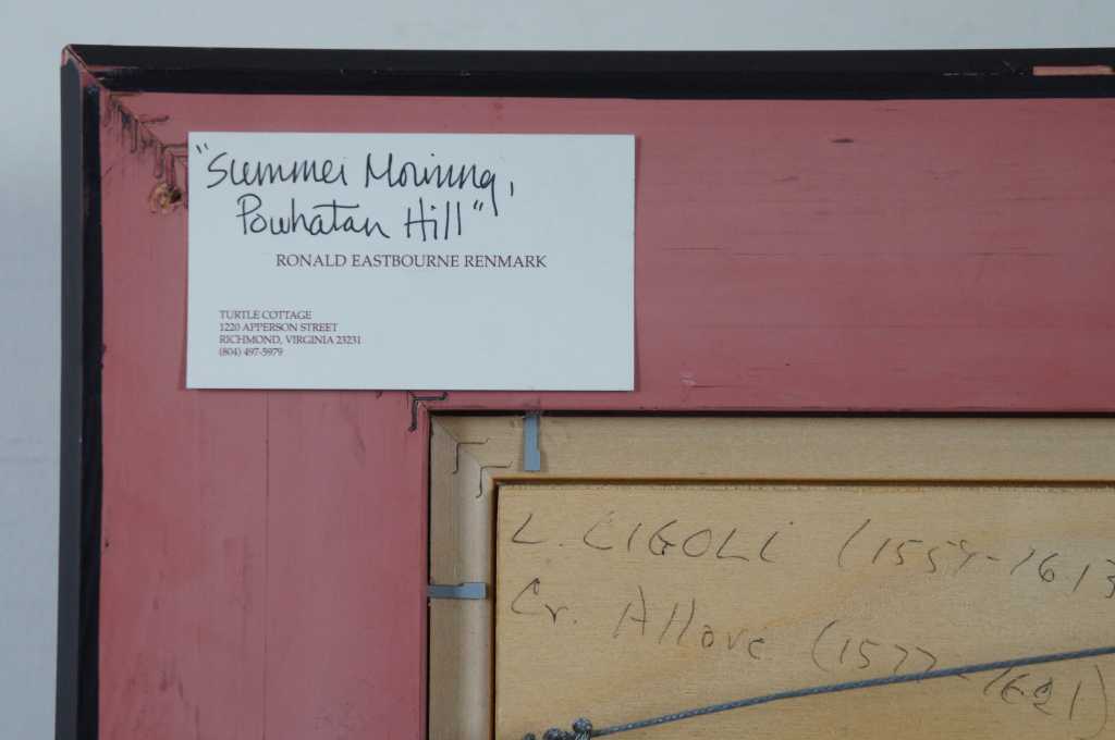 Ronald Eastbourne Renmark (American 20th-21st Century) is a romantic realist painter from Richmond Virginia. This fine and large scale painting by acclaimed artist R. E. Renmark shows his consummate skill at capturing plain air painting skills and creating subtle gradations of color and mood with thin washes and glazes unifying the two in one magical moment on canvas. Born in 1938 Ronnie, as his friends call him, has studied abroad and been in the worlds of interior design, painting, stage sets and landscape design for his entire life. This painting is a fine example of his mature work and is almost photographically realistic while at the same time completely ethereal in nature not meaning to simply capture a moment but to cause a thoughtful contemplative mood within a busy hectic world. Many of the works produced by Mr. Renmark are framed by the artist to add further dimension to the image as with this painting and fine frame has been used to create a richer feeling.