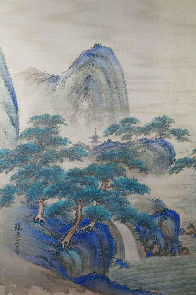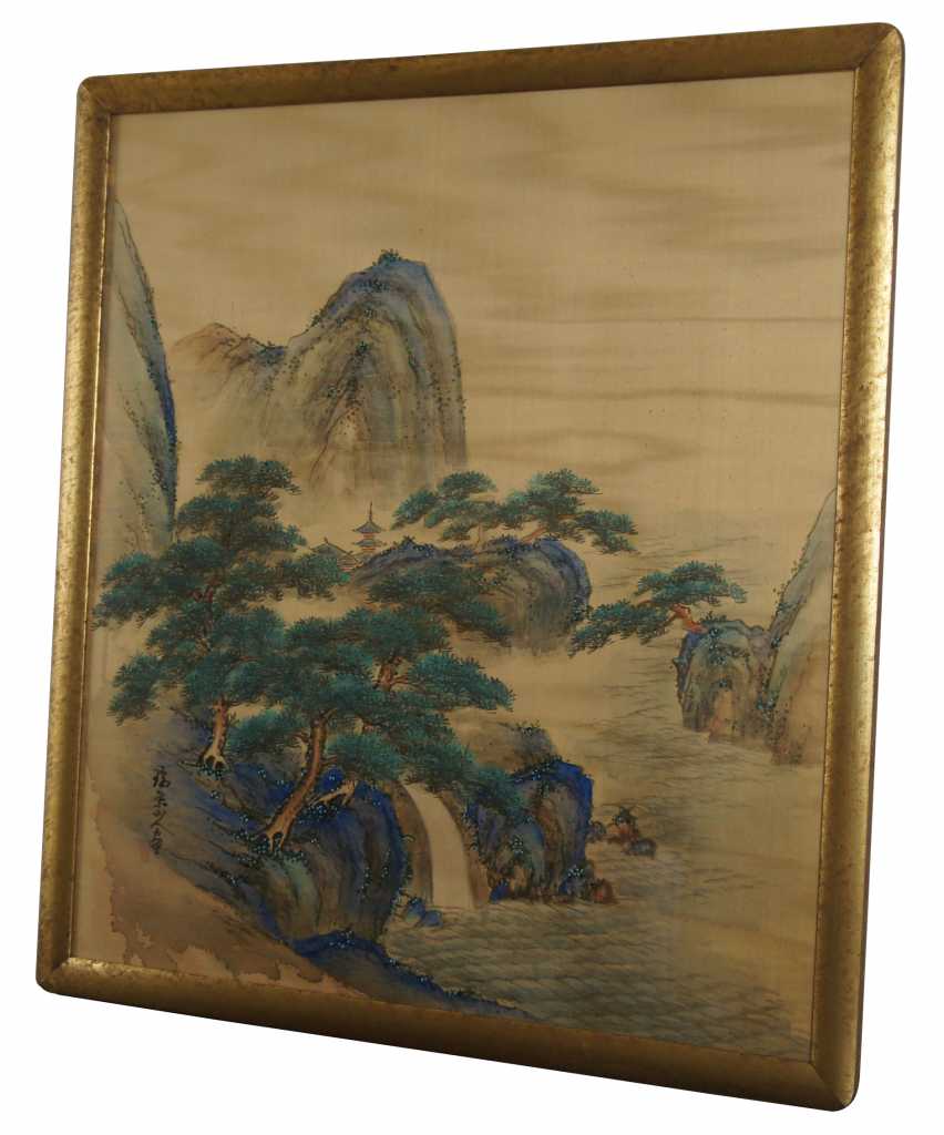 Gorgeous oriental hand painted landscape on silk. Depicts a mountainous setting with cherry blossom trees along the water with a pagoda in the distance.