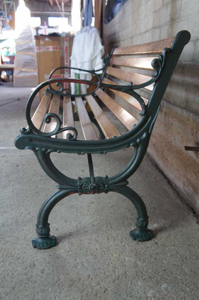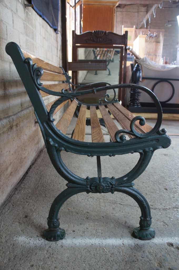 Vintage Victorian inspired oak plank park bench. Features empire revival styling with ""x"" shaped supports, scrolled arms, and acanthus design.