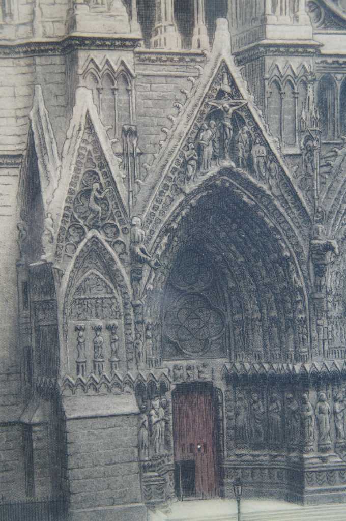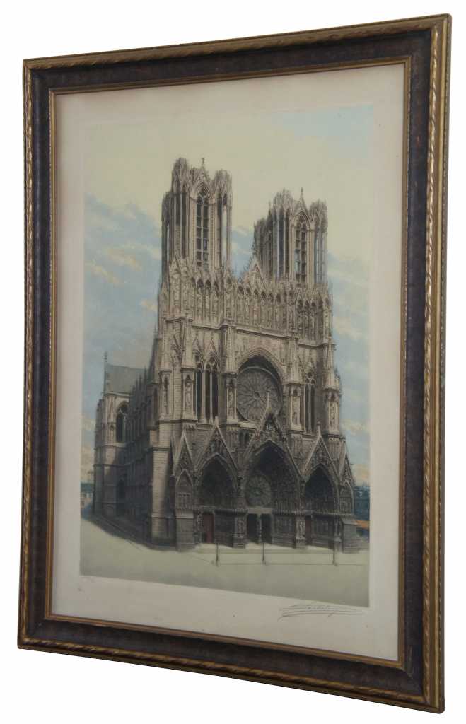 "Antique colored etching of Rheims (Reims) Cathedral by Victor Valery Lochelongue 1870-1930, limited edition 152/380.