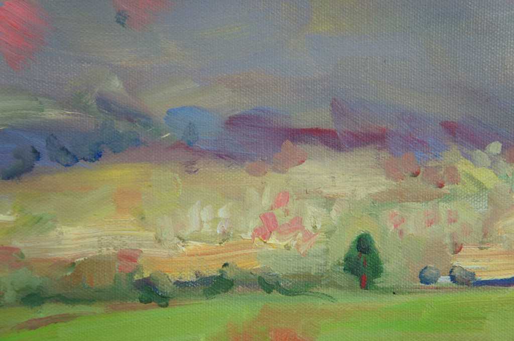 Impressionist painitng of cows in the countrysidex oil on canvas. Ann McLean has been painting since she moved to Quadra in 1978. Interested in all subject matter, she always returns to the landscape of Quadra which is her constant inspiration. Her lyric poetry is also influenced by nature and her political satire is commentary on island life and the current state of world affairs.