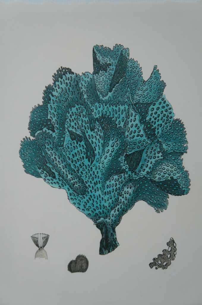 "Turquoise coral reproduction printed on archival paper, floated on oyster linen and finished in a silver bamboo frame.