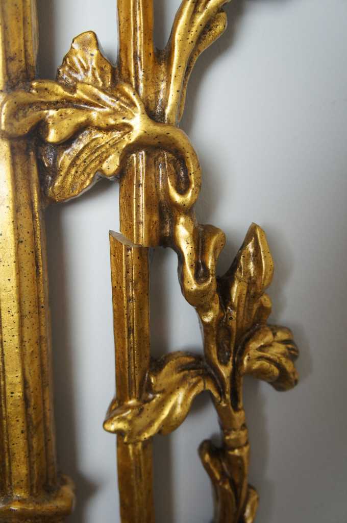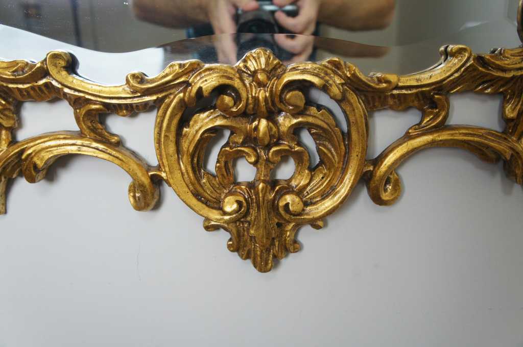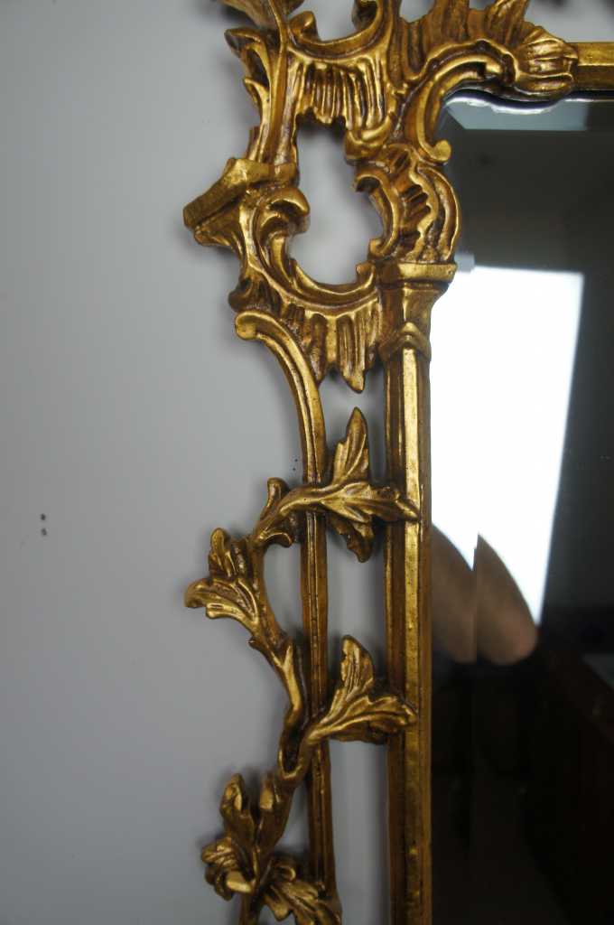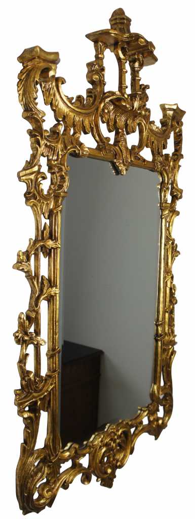 English Chinese Chippendale style (20th century) gilt carved mirror with pagoda form pediment and open design framed border. Made from resin or composite with beveled mirror.