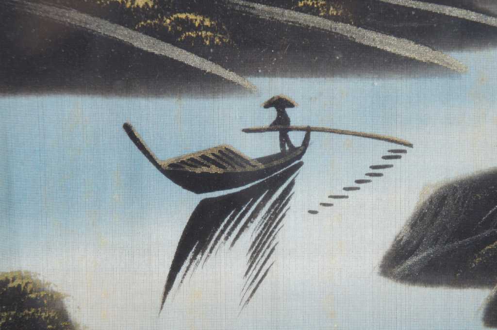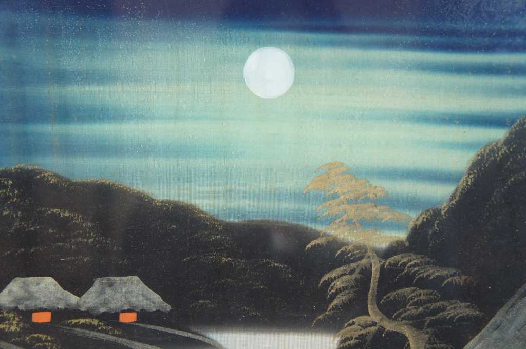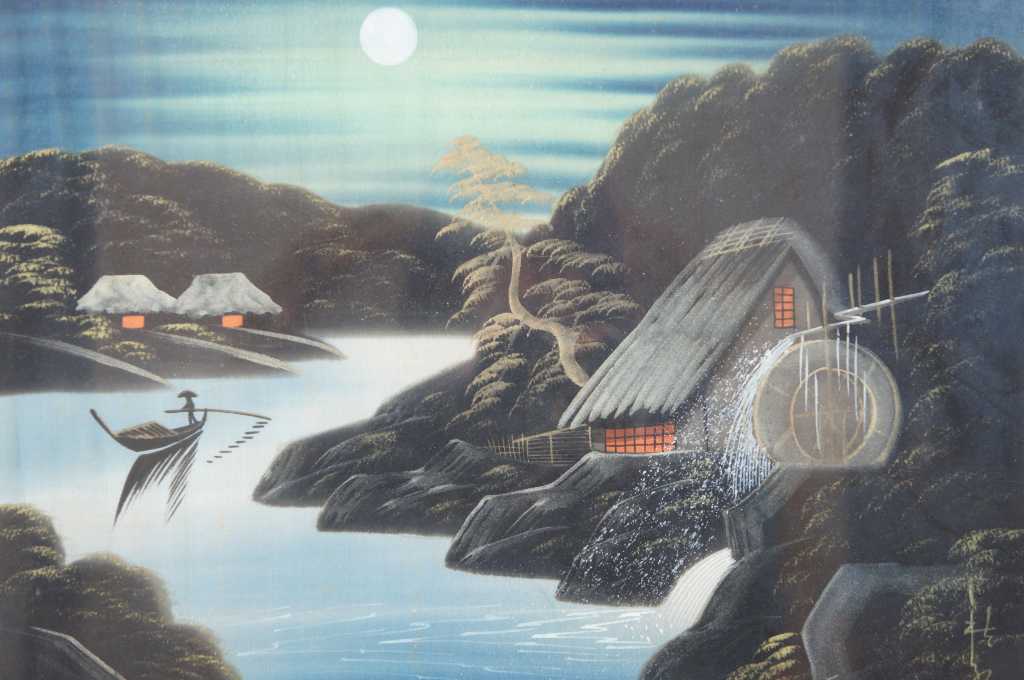 Vivid 20th Century Japanese painting on silk. Features a night scene on the river by the waterwheel. A full moon can be seen in the background as a fisherman comes to shore. Painting is matted and framed with faux bamboo deisgn. Signed lower right.