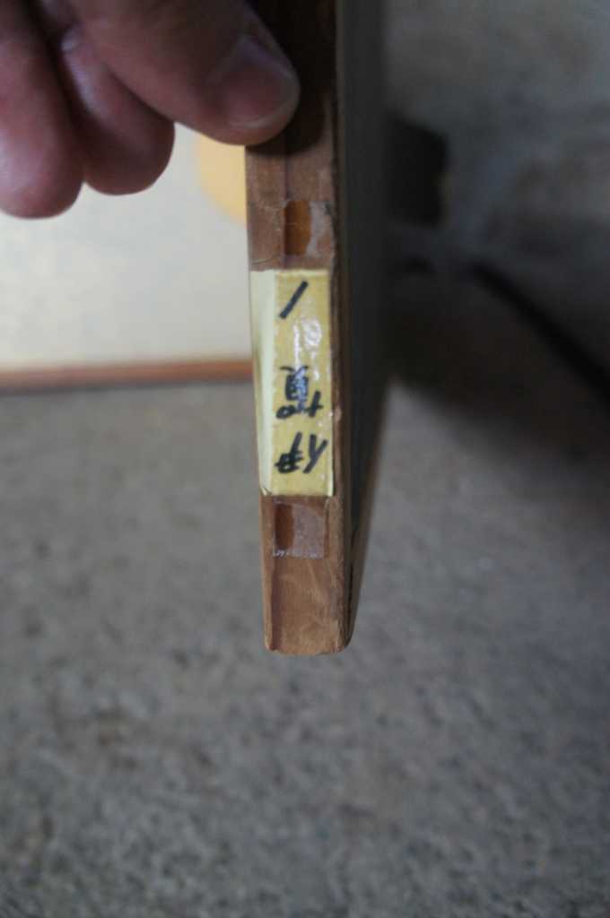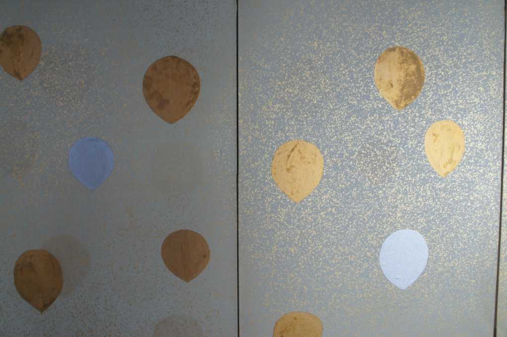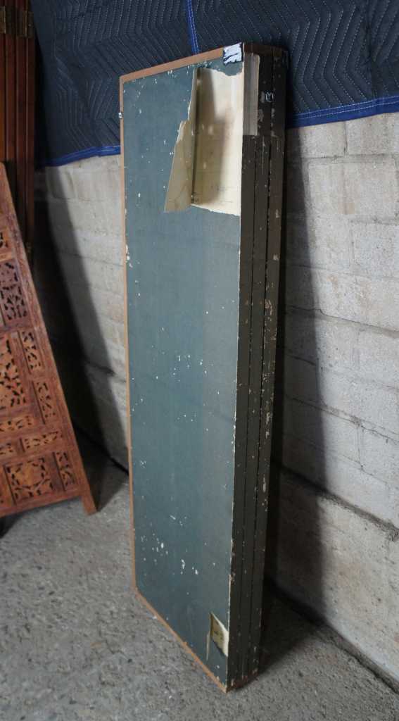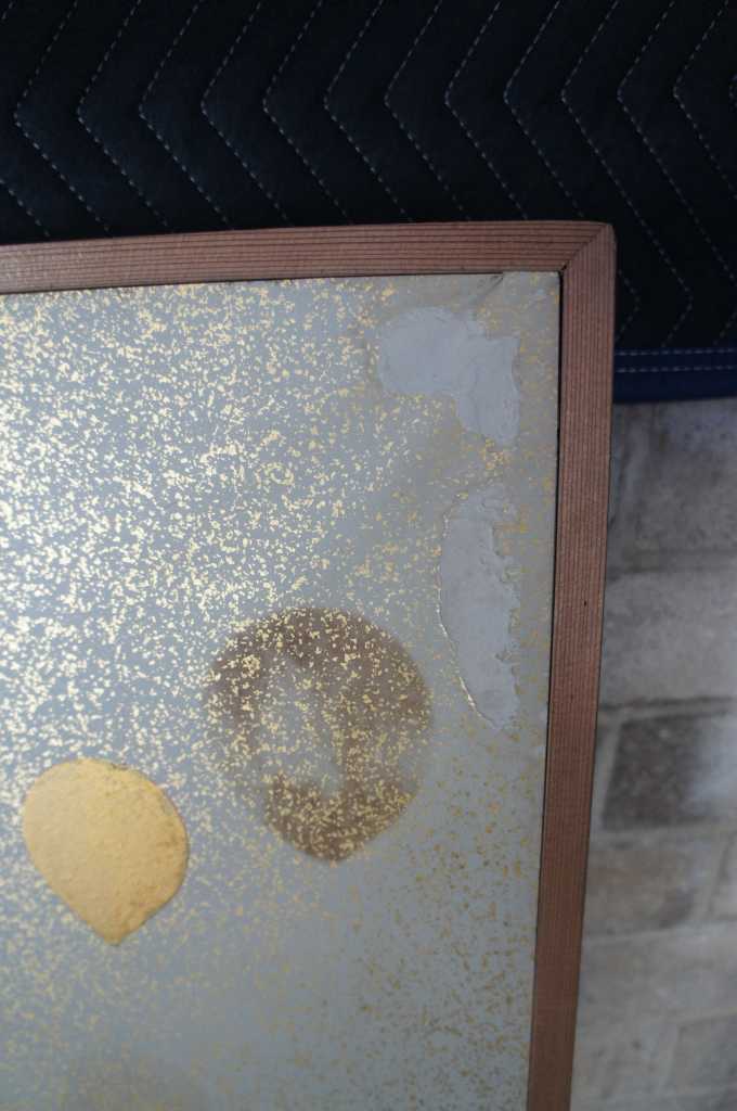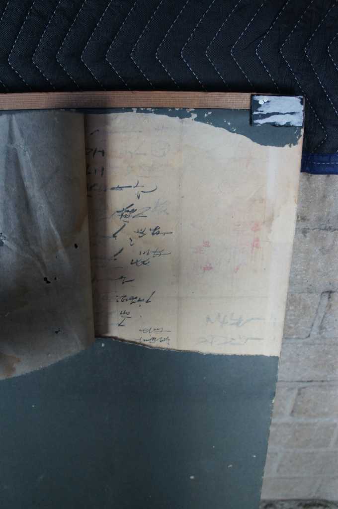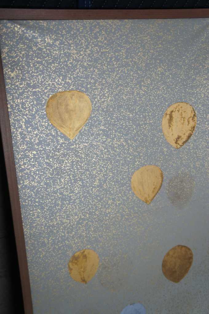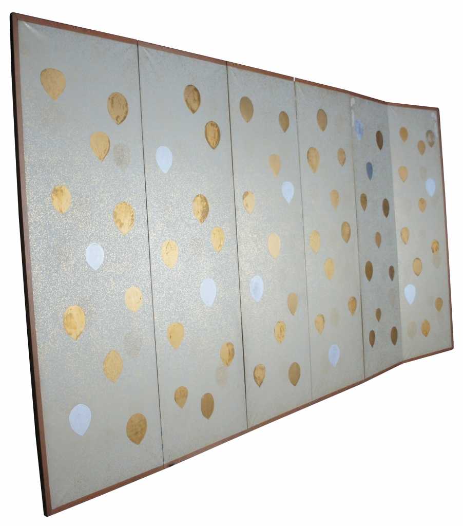 Hand decorated Japanese six panel folding screen. Gold foil backing with teardrop shaped gold and silver accents. Panels framed in wood. Along backing traditional Japanese writing can be seen along the rice paper.