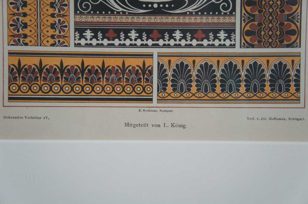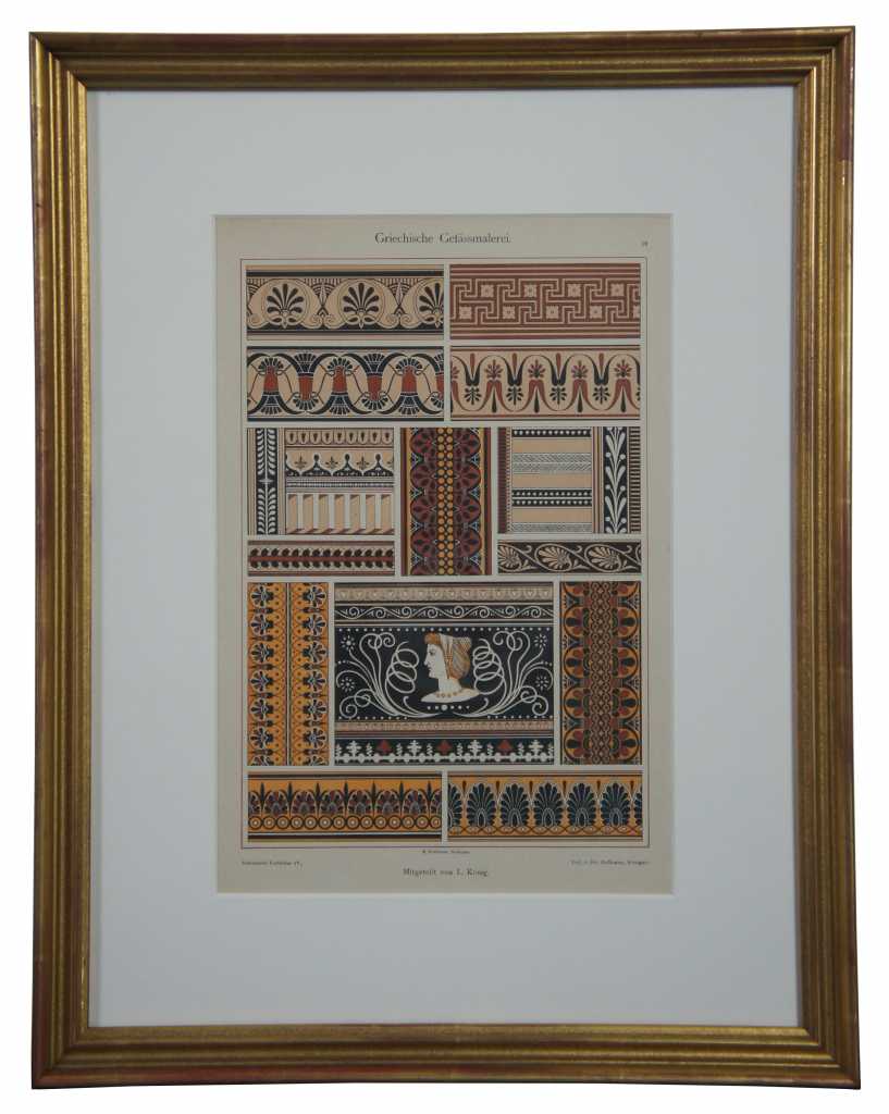 2 Emil Hochdanz architectural book plate prints. Feature mosic tiles, floor and ceiling embellishments/ornaments. One shows mosaic floors of Pompeii, Romisch (roman), Mosaik Fussboden; the other Griechische Gefassmalerei (greek), Mitgeteilt von L. King (communicated by the king). Stuttgart Hoffmann.