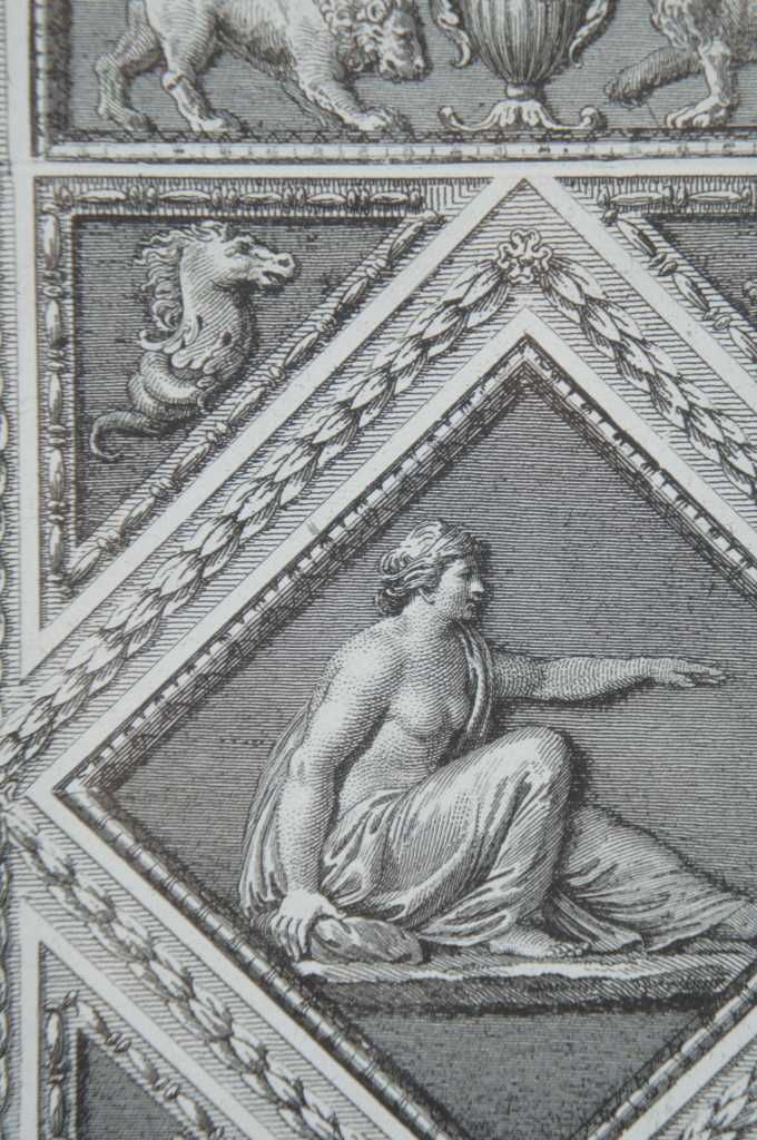 AN UNIDENTIFIED MASTER-ENGRAVER IN THE MID 18TH CENTURY CREATED THESE ROMANESQUE PANELS. ENGRAVERS OF THIS TIME WERE IN MOST CASES SUPPORTED BY RICH PATRONS WHO WOULD GIVE REPRODUCTIONS AS GIFTS TO THEIR BUSINESS ASSOCIATES AND FRIENDS. THE QUALITY OF THIS LINE DRAWING IS AMONG THE MOST BEAUTIFUL IN ALL FORMS OF ENGRAVING. NOTICEABLE BY THE MINUTE DETAILS AND LINEAR DEFINITION.