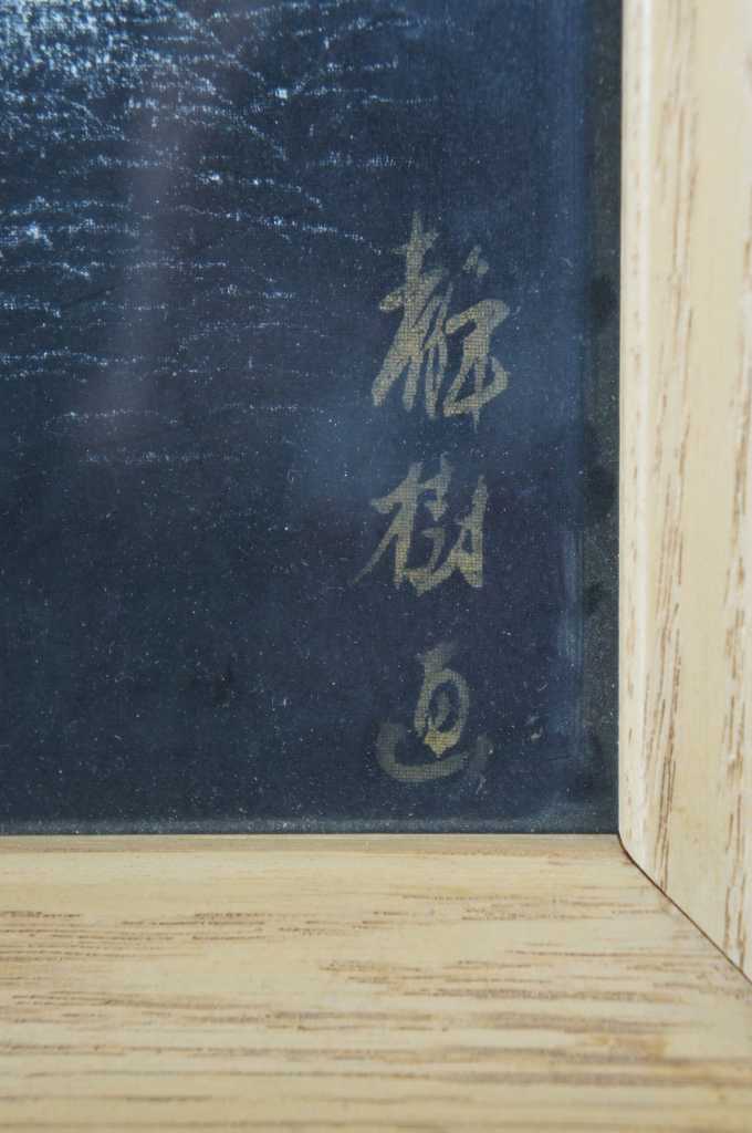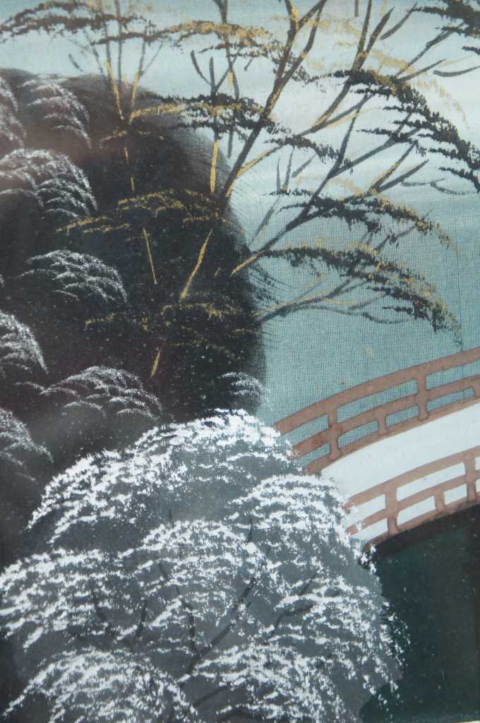 Two lovely Japanese paintings. Handpainted on silk, with oak frame. Each features a moon lit landscape showing a pagoda near a bridge and water sourse. Signed lower right.