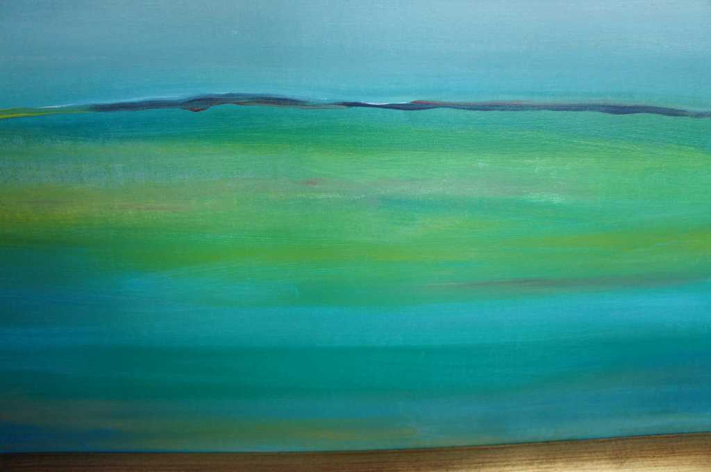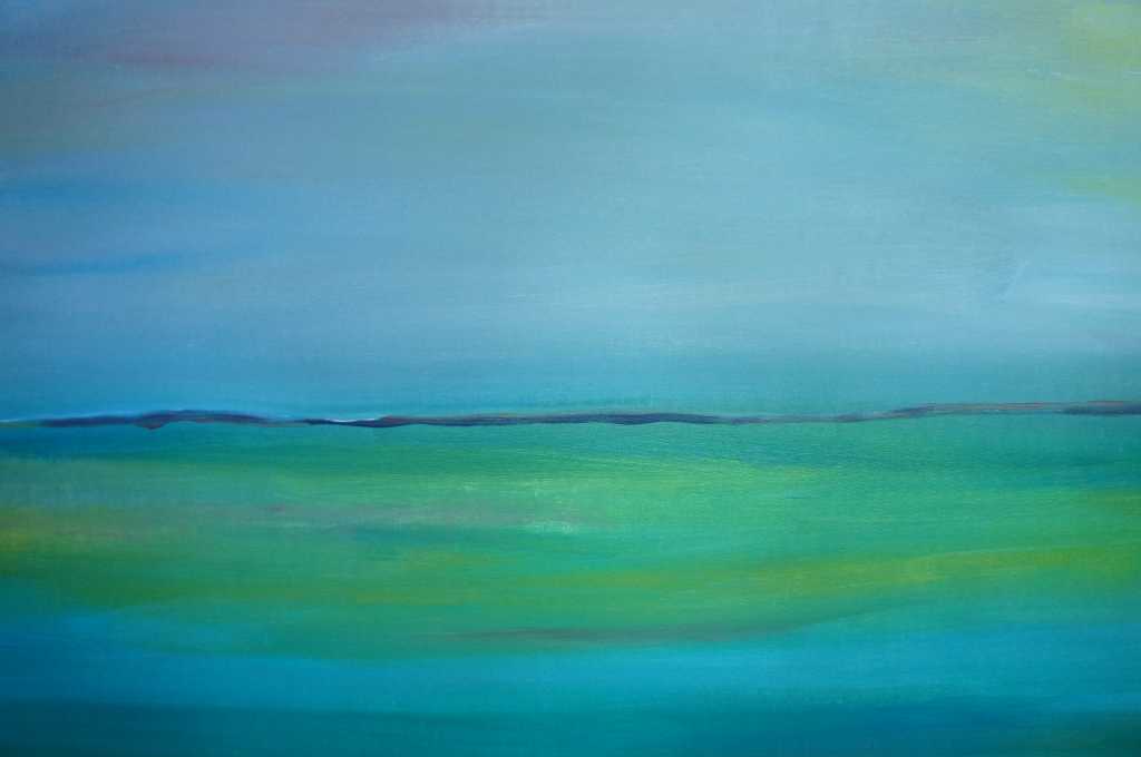 Abstract impressionist seascape singed LE. Features towards land with greens and blues, painted by a university of Michigan grad student in the 1990s. Oil on canvas, framed in gold.