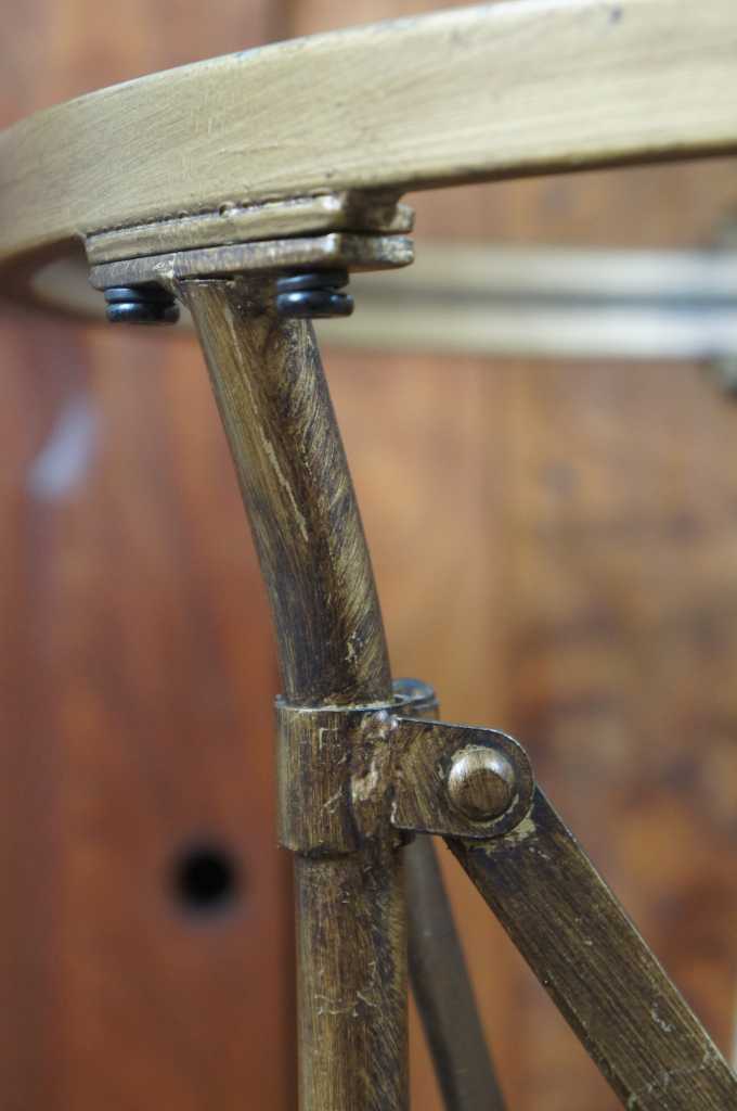Round brass table featuring a foldable frame, paw feet and glass top.