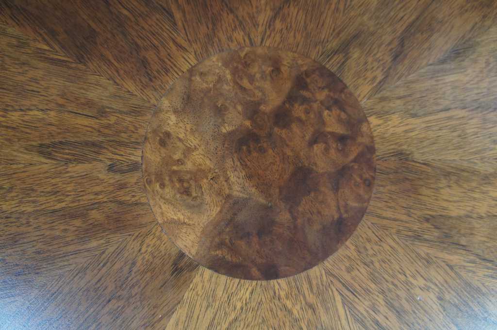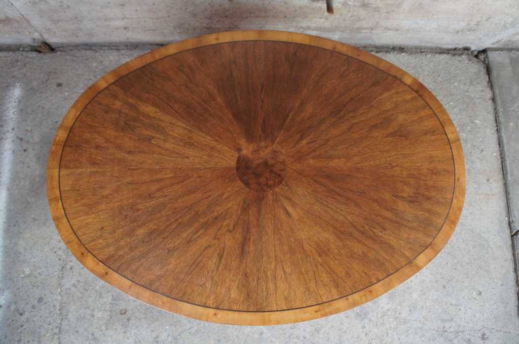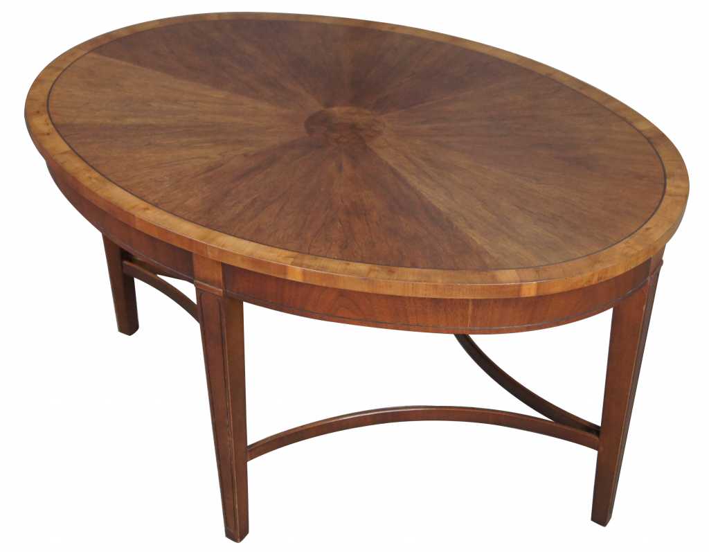 Baker Furniture Laura Ashley Sheraton inspired coffee table. Oval shaped with banded top, made from mahogany with burlwood center. Tapered legs are connected by bentwood stretchers.