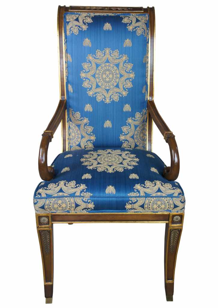 Karges French neoclassical regency style dining chairs with klismos leg. Features bronze ormolu, solid wood construction, nicely carved details, original label, shapely saber legs, sleek sculptural form, circa mid-20th century. Silk scalamandre upholstery with insects and gold medallions and flourishes.