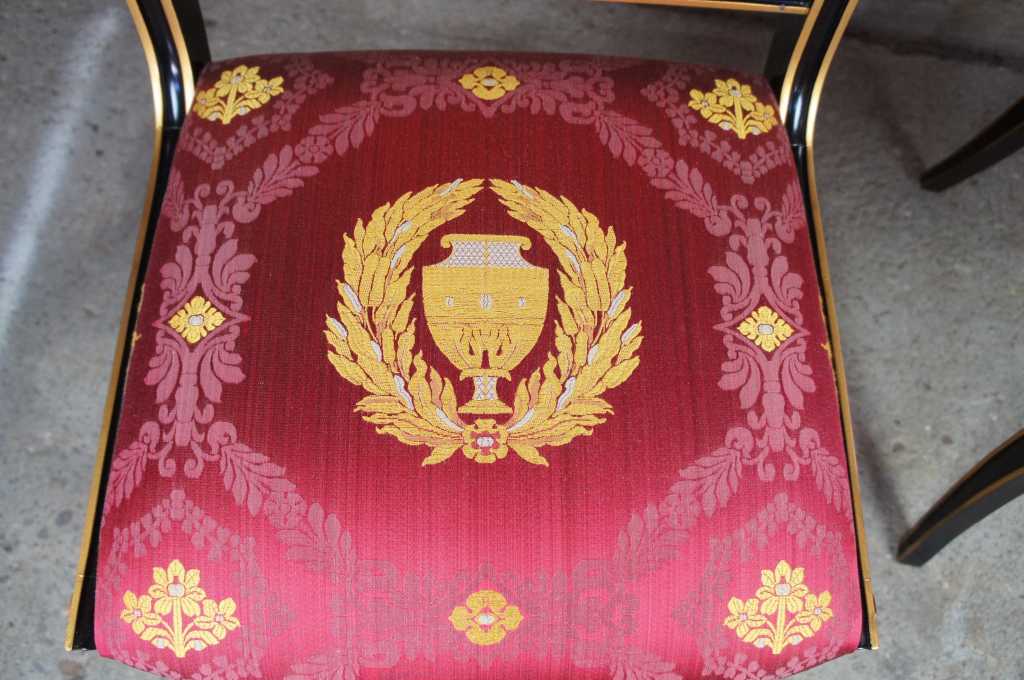A beautiful pair regency style black and gold dining or side chairs. Features a sleigh shaped back and traditional red sclamandre fabric with urns at the center. Attributed to Maitland-smith or Henredon, however the paperwork was lost.