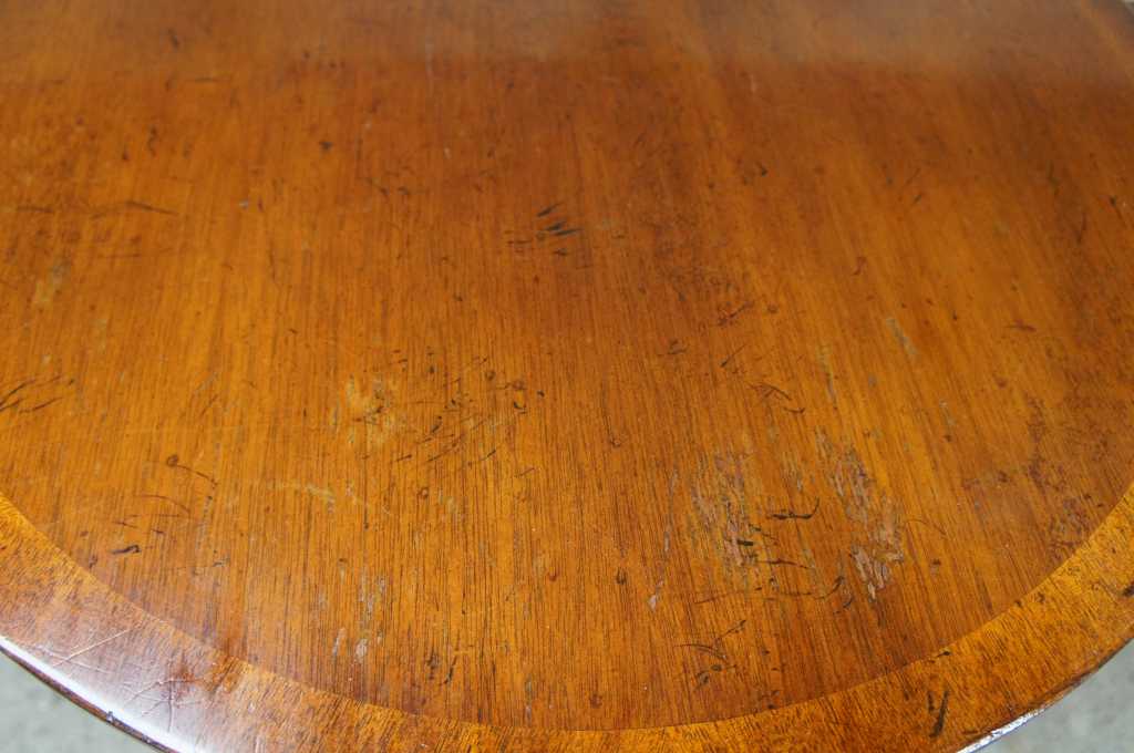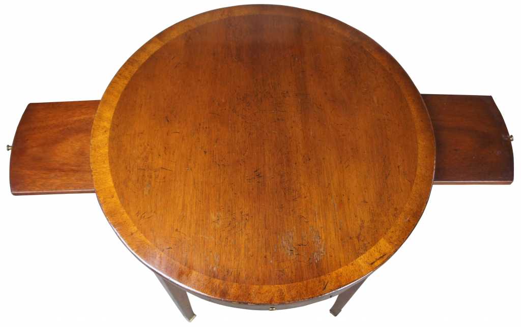 Round side table by Baker Furniture. Features distressed mahogany round top with banding and side pullout / pull-out trays. The table has delicate inlay around the aprons and the top of the four tapering legs.