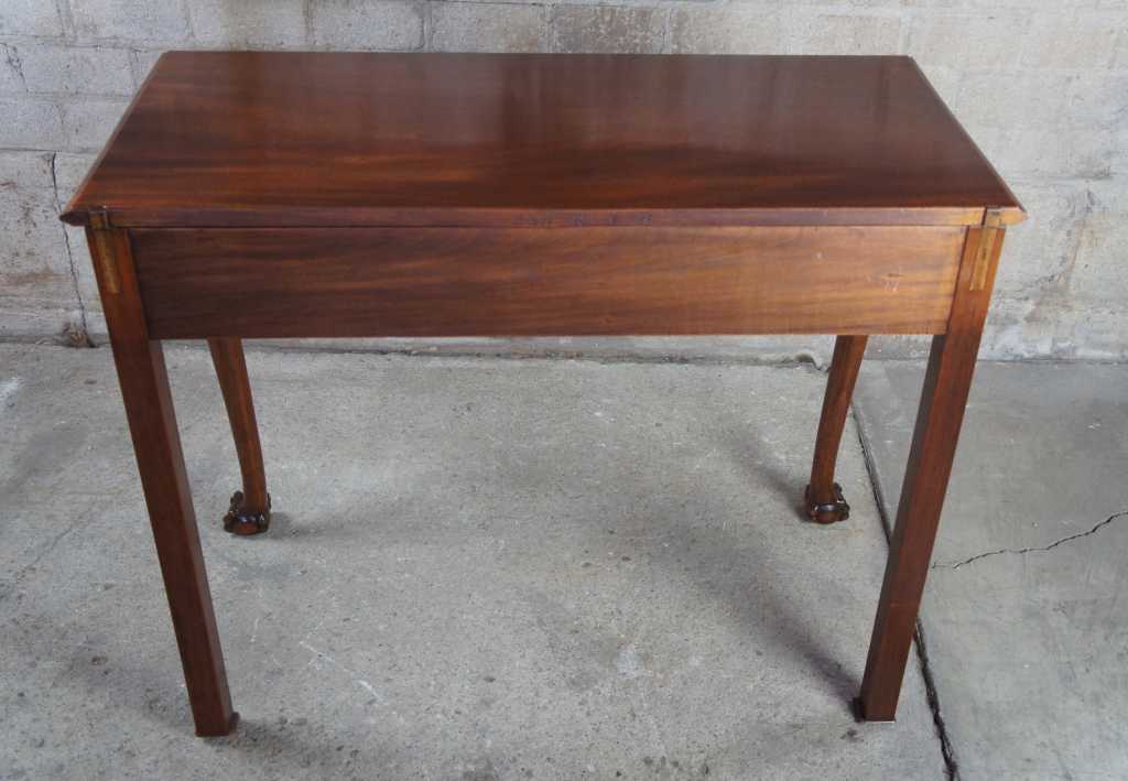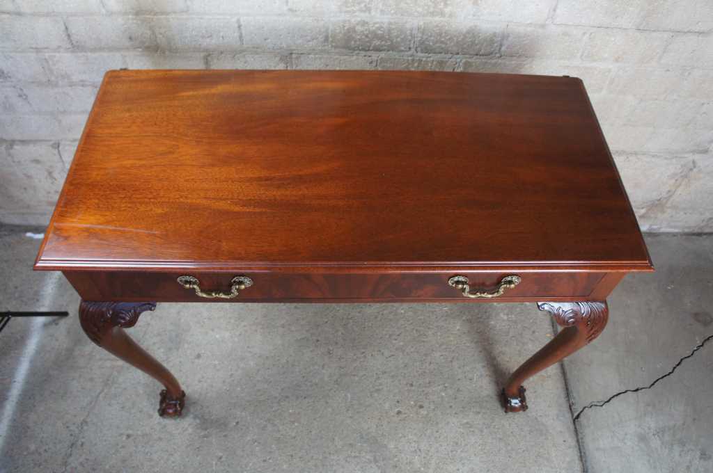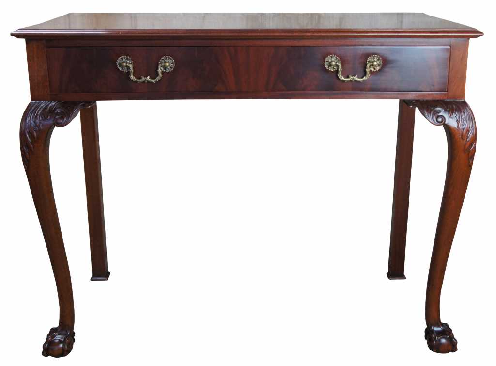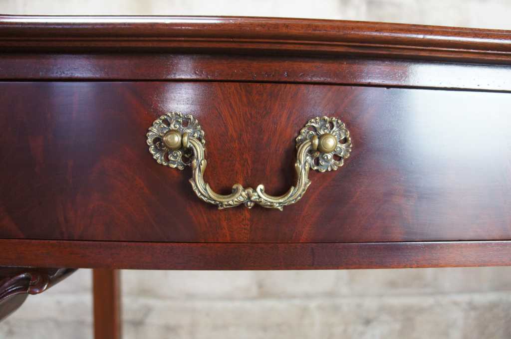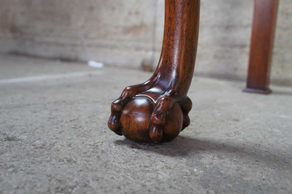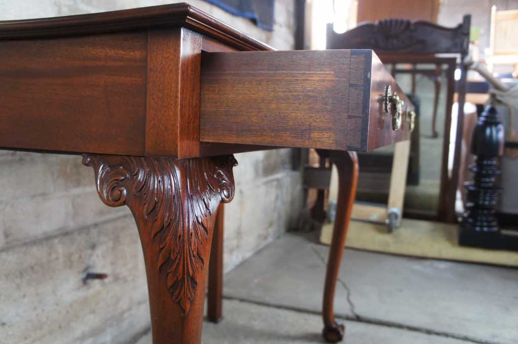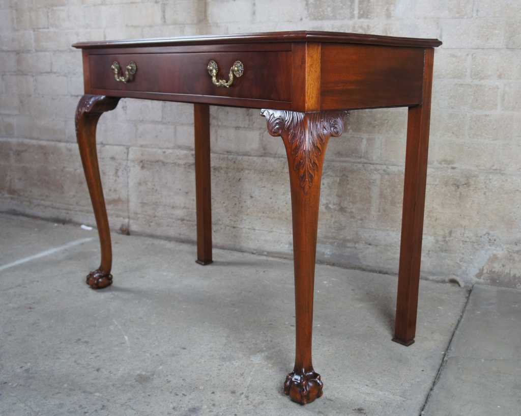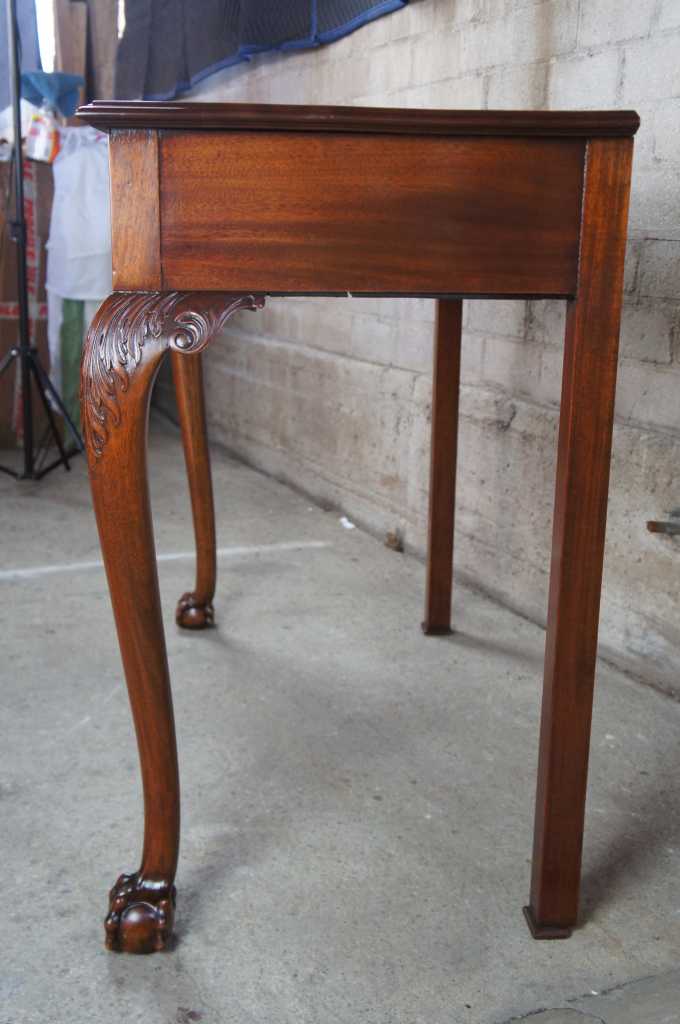 Quaint Chippendale style buffet. Features a flame mahogany central drawer with compartments for silverware, resting upon cabriole legs with intricate acanthus carvings leading to ball and claw feet.