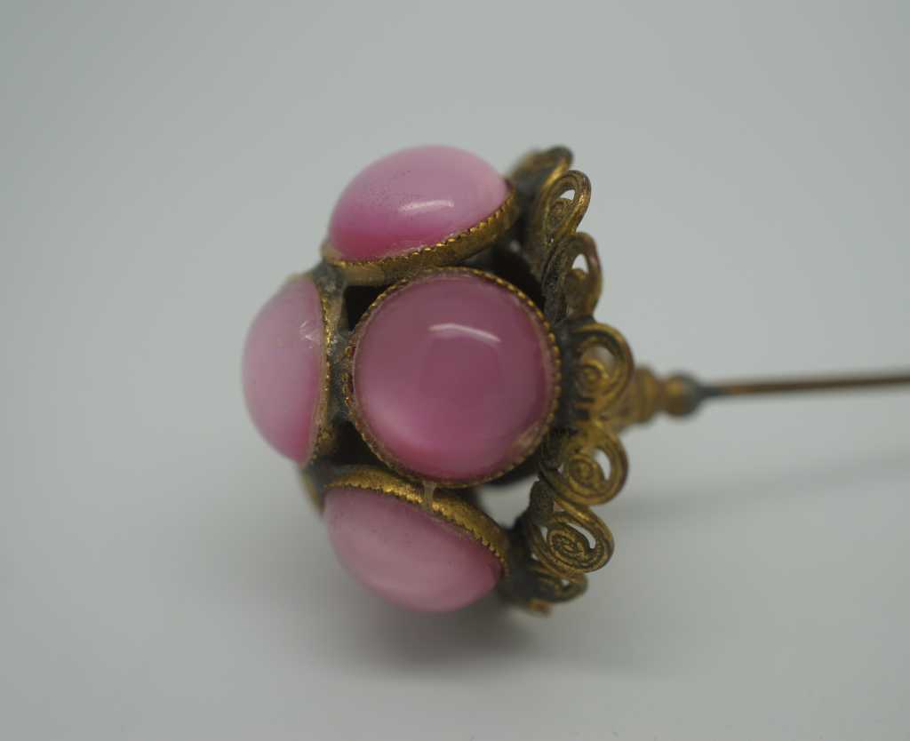 Two antique hat pins. Both feature floral clusters of rhinestones.