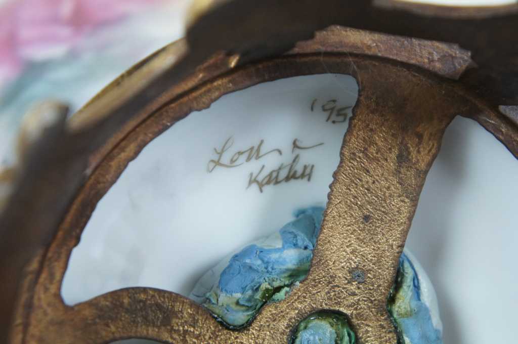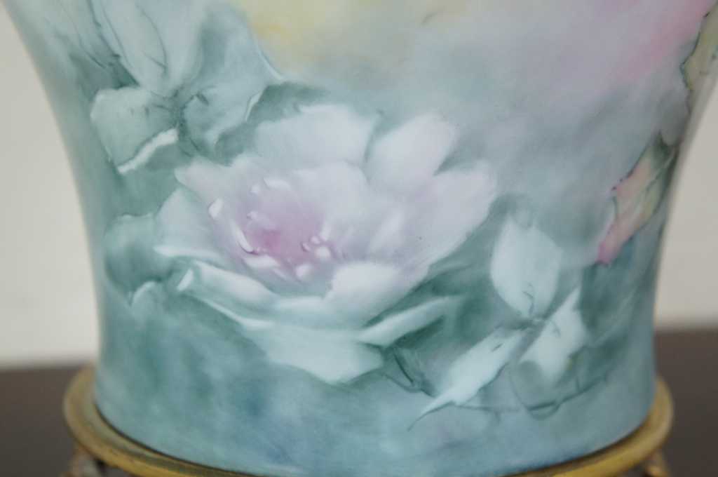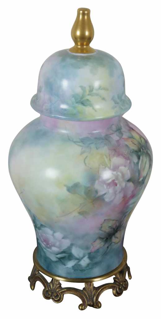 Antique hand painted urn with lid and brass attached pedestal base. Marked underneath.