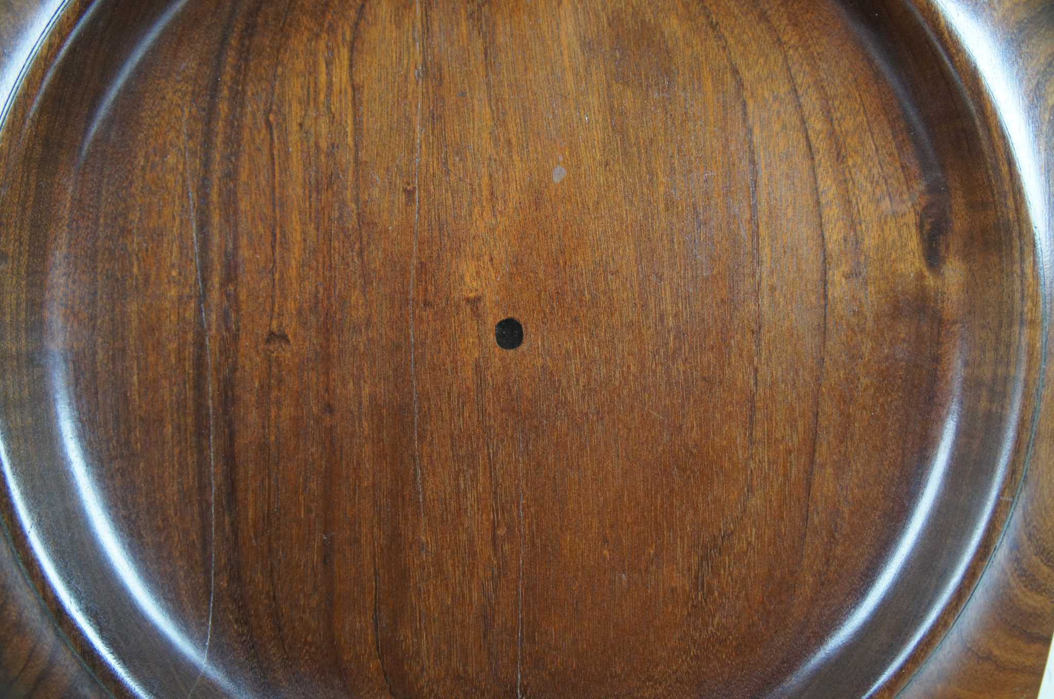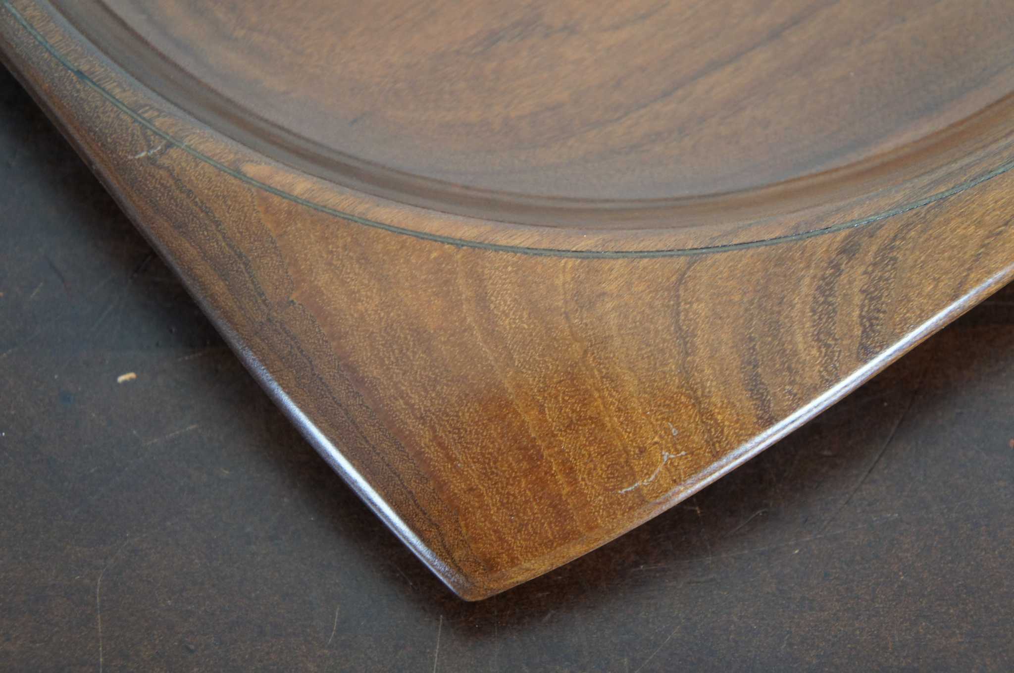 Mid century modern tray or plate by Oskar Kirsten. Made of Purpleheart wood, marked on back 1850 with signature. Oskar Kirsten is an award winning renown wood turner and retired Mechanical Engineer. He has a background in developing laser based instruments and is now retired. His life now includes enjoying time with his grandkids, enjoying his retirement, happily turning wood, playing flamenco guitar, and driving his finally restored 1960 190 SL Mercedes.