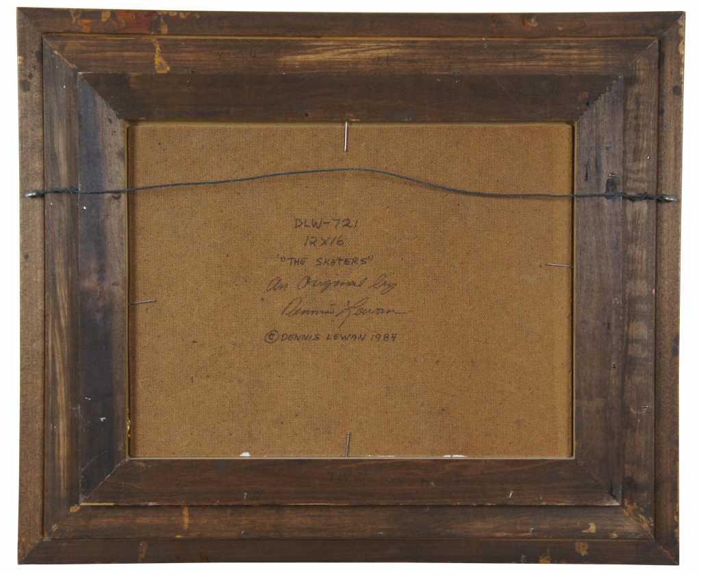 "Circa 1984 oil painting on board by Dennis Lewan, features ice skaters along the water in a small villiage. Two great bios about Mr. Lewan below: Bio 1: Dennis Patrick Lewan’s interest in art began at the age of five and drawing became one of this favorite activities. Never having much in the way of formal fine art classes, Dennis would find himself in trouble at school because of drawing instead of studying the regular subjects and also displayed a natural talent for music after taking some lessons on the accordion.