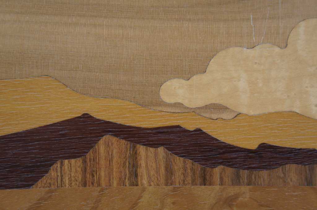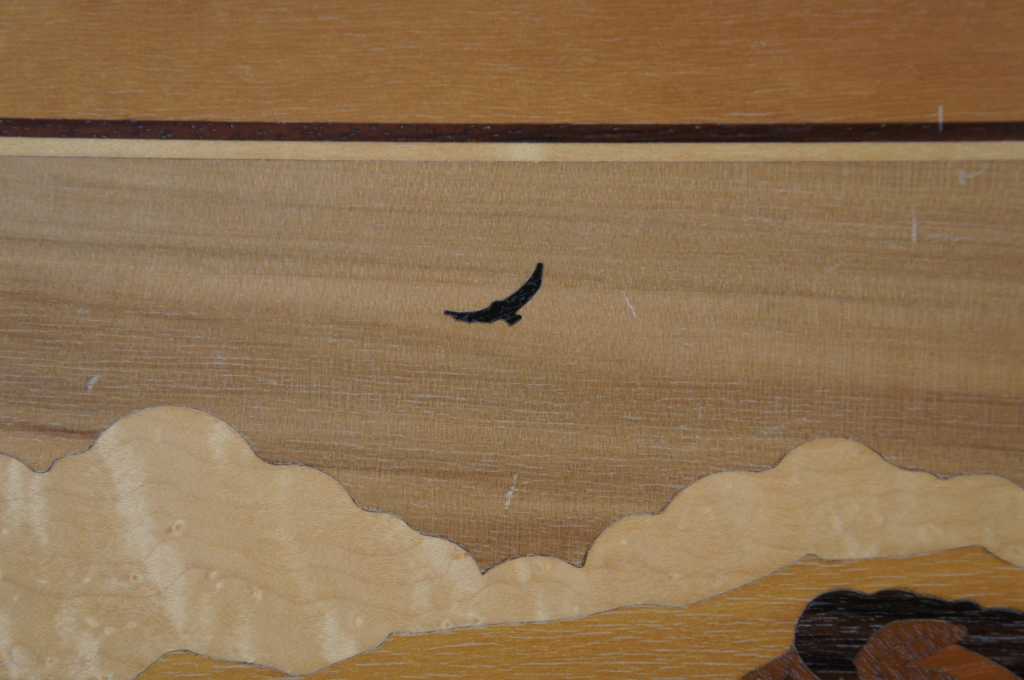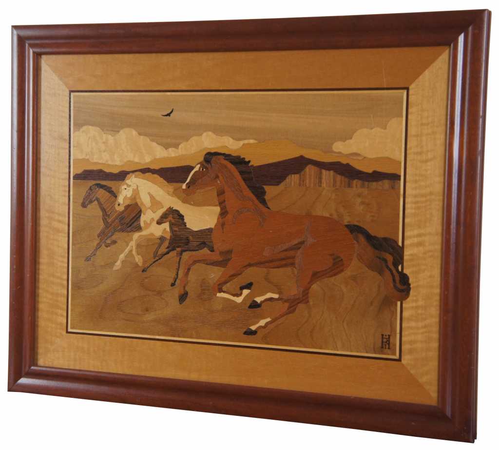 Marquetry Inlay Art by Hudson River Inlay. Titled Mustangs. Featuring exotic woods from Africa, USA, North American, Brazil, Honduras, C. Africa, Europe, and the Pacific Northwest.. Wood species used: Anegre, Paduak, Maple, Red Gum, Birdseye Maple, Dyed Tulip, Purpleheard, Santos Rosewood, Mahogany, Sapele, Ebony, Harewood, Wenge, Birch, Madrone, and Imbuya. On the backside of the art is a key showing which woods are used where, pretty neat! Style number 516.